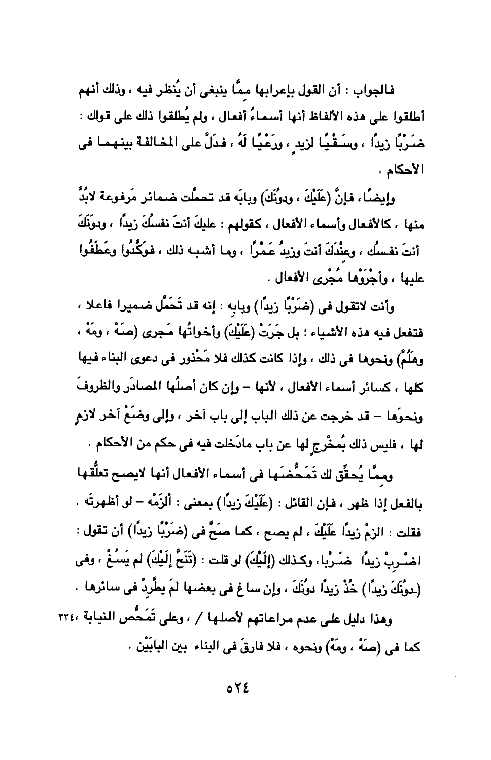 وأنت لا تقول في (ضربًا زيدًا) وبابه: إنه قد تحمل ضميرا فاعلا، فتفعل فيه هذه الأشياء؛ بل جرت (عليك) وأخواتها مجرى (صه، ومه، وهلم) ونحوها في ذلك، وإذا كانت كذلك فلا محذور في دعوى البناء فيها كلها، كسائر أسماء الأفعال، لأنها- وإن كان أصلها المصادر والظروف ونحوها- قد خرجت عن ذلك الباب إلى باب آخر، وإلى وضع آخر لازمٍ لها، فليس ذلك بمخرجٍ لها عن باب ما دخلت فيه في حكم من الأحكام.
