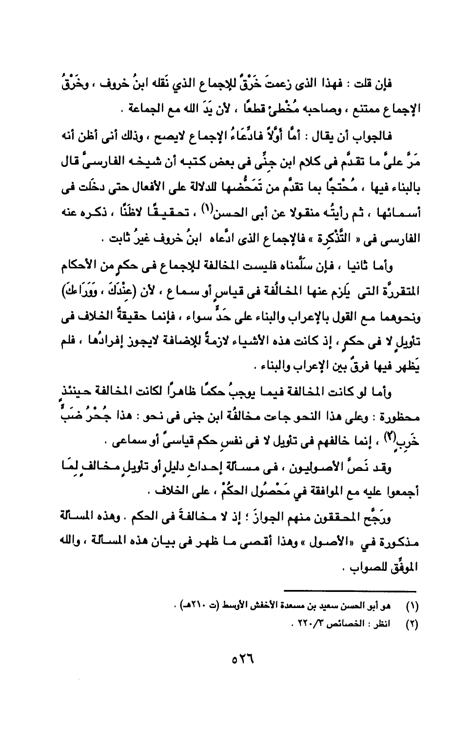 وأما لو كانت المخالفة فيما يوجب حكمًا ظاهرًا لكانت المخالفة حينئذٍ محظورة: وعلى هذا النحو جاءت مخالفة ابن جنى في نحو: هذا جحر ضب خرب، إنما خالفهم في تأويل لا في نفس حكم قياسي أو سماعي.
