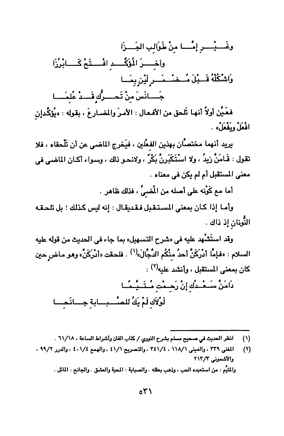 وقد استشهد عليه في "شرح التسهيل" بما جاء في الحديث من قوله عليه السلام: "فإما أدركن أحد منكم الدجال". فلحقت "أدركن" وهو ماضٍ حين كان بمعنى المستقبل، وأنشد عليه: