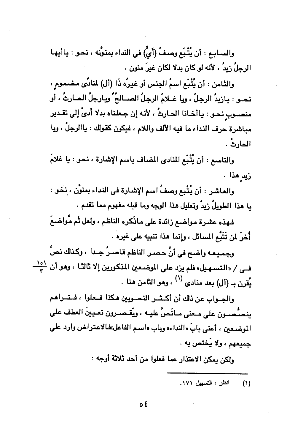 والعاشر: أن يتبع وصف اسم الإشارة في النداء بمنون، نحو: يا هذا الطويل زيد وتعليل هذا الوجه وما قبله مفهوم مما تقدم.