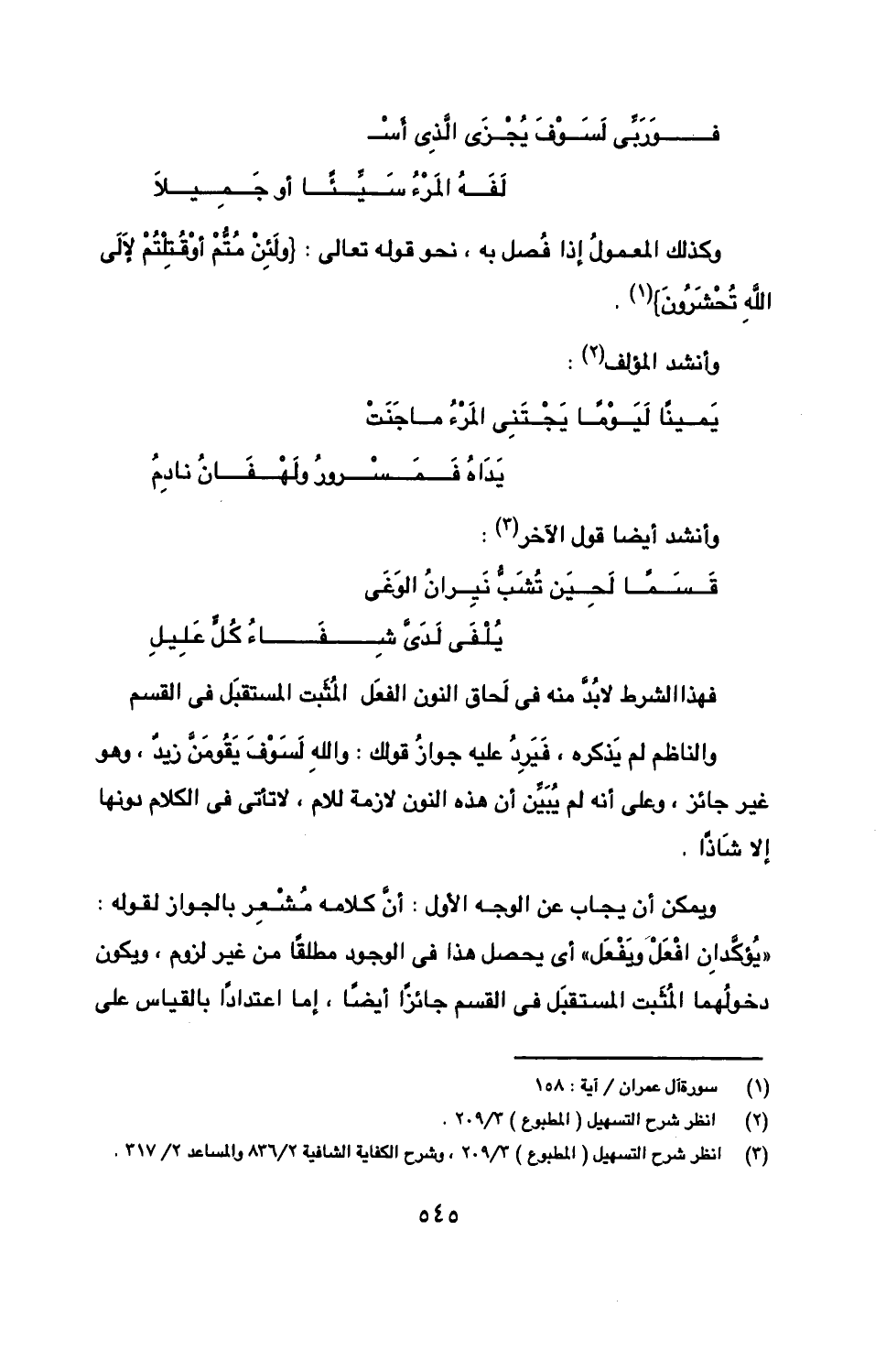 فهذا الشرط لابد منه في لحاق النون الفعل المثبت المستقبل في القسم والناظم لم يذكره، فيرد عليه جواز قولك: والله لسوف يقومن زيد، وهو غير جائز، وعلى أنه لم يبين أن هذه النون لازمة للام، لا تأتي في الكلام دونها إلا شاذًا.