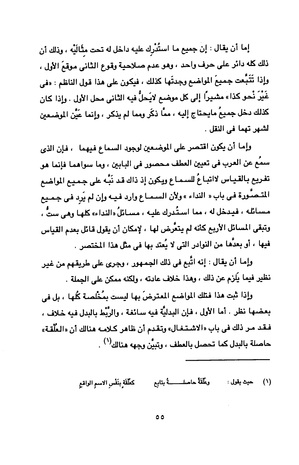 وإما أن يكون اقتصر على الموضعين لوجود السماع فيهما، فإن الذى سمع عن العرب في تعيين العطف محصور في البابين، وما سواهما فإنما هو تفريع بالقياس لا اتباع للسماع ويكون إذ ذاك قد نبه على جميع المواضع المتصورة في باب «النداء» ولأن السماع وارد فيه وإن لم يرد في جميع مسائله، فيدخل له، مما استدرك عليه، مسائل «النداء» كلها وهي ست، وتبقى المسائل الأربع كأنه لم يتعرض لها، لإمكان أن يقول قائل بعدم القياس فيها، أو بعدها من النوادر التى لا يعتد بها في مثل هذا المختصر.