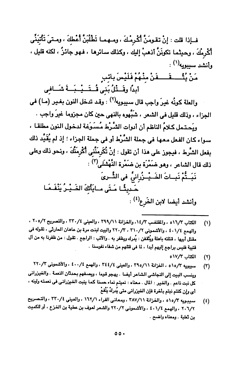 والعلة كونه غير واجب قال سيبويه: وقد تدخل النون بغير (ما) في الجزاء، وذلك قليل في الشعر، شبهوه بالنهي حين كان مجزوما غير واجب.