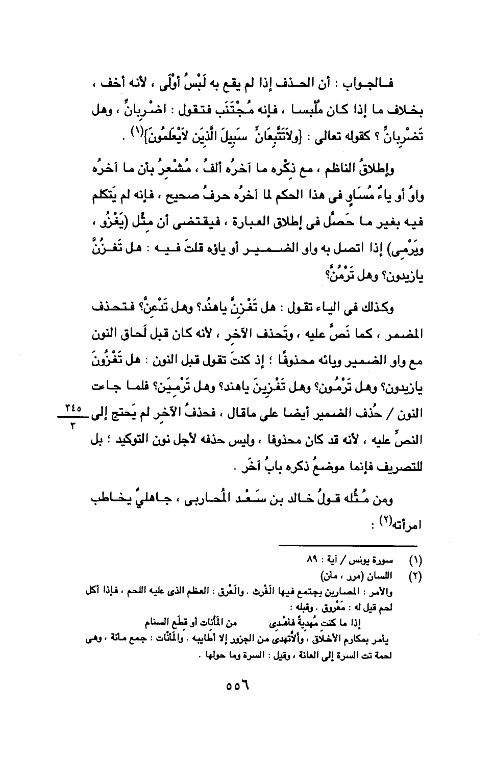 فالجواب: أن الحذف إذا لم يقع به لبس أولى، لأنه أخف، بخلاف ما إذا كان ملبسا، فإنه مجتنب فتقول: اضران، وهل تضربان؟ كقوله تعالى: {ولا تتبعان سبيل الذين لا يعلمون}.