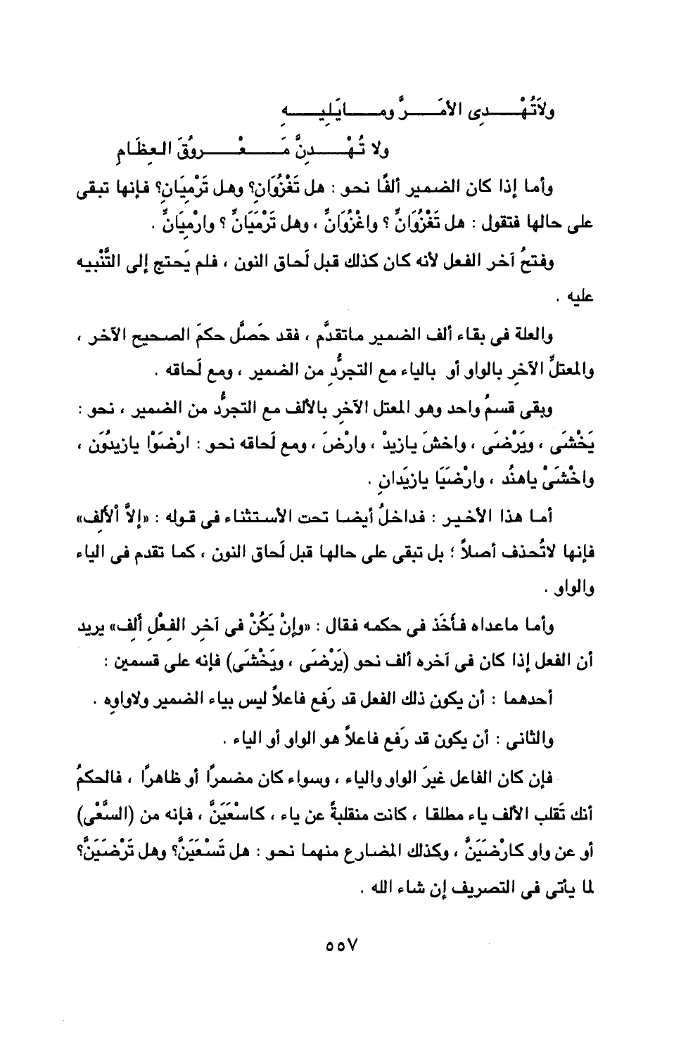 وبقي قسم واحد وهو المعتل الآخر بالألف مع التجرد من الضمير، نحو: يخشى، ويرضى، واخشن يا زيد، وارض، ومع لحاقه نحو: ارضوا يا زيدون، واخشى يا هند، وارضيا يا زيدان.