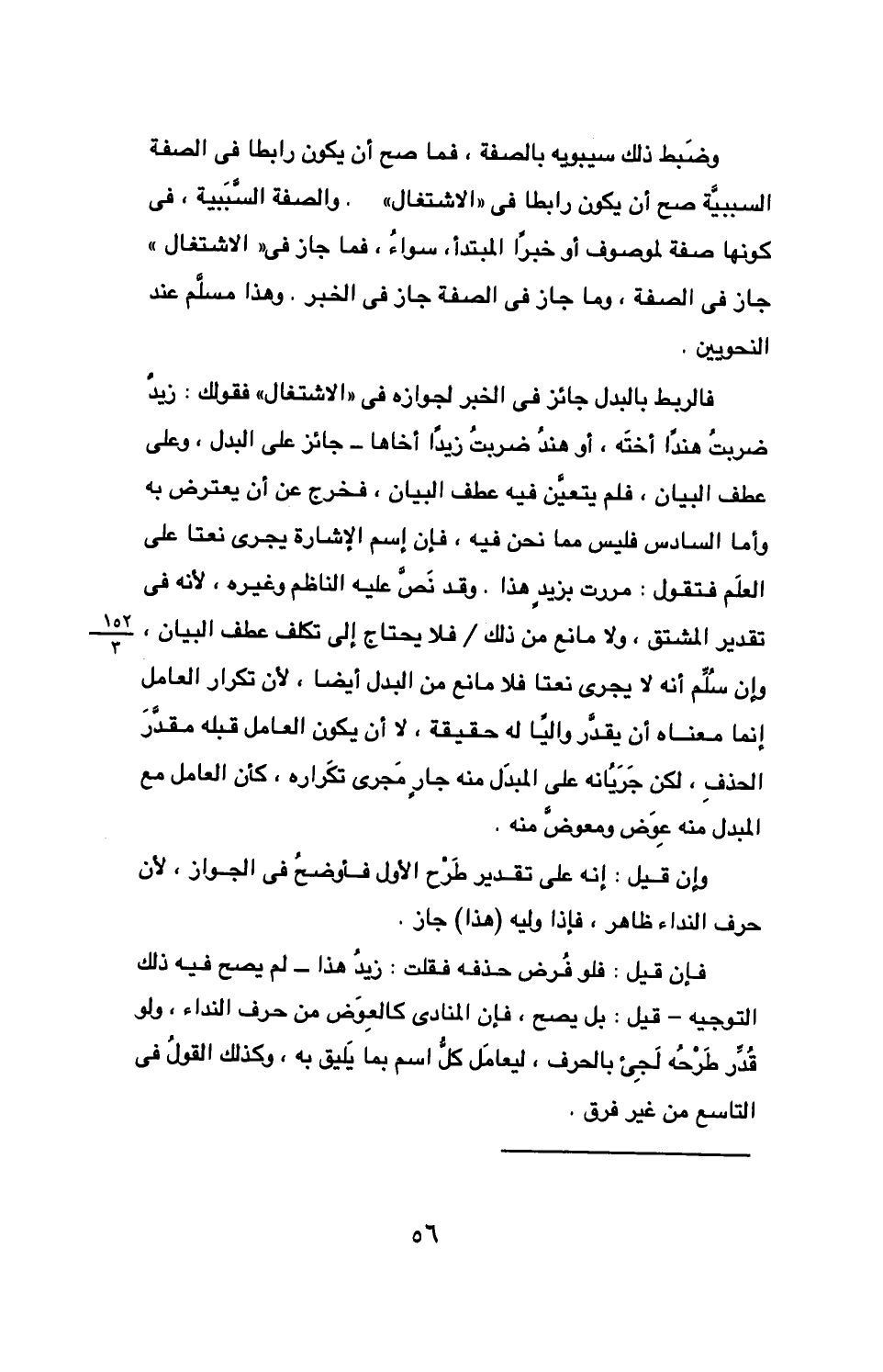 فالربط بالبدل جائز في الخبر لجوازه في «الاشتغال» فقولك: زيد ضربت هند أخته، أو هند ضربت زيدا أخاها- جائز على البدل، وعلى عطف البيان، فلم يتعين فيه عطف البيان، فخرج عن أن يعترض به وأما السادس فليس مما نحن فيه، فإن اسم الإشارة يجرى نعتا على العلم فتقول: مررت بزيد هذا. وقد نص عليه الناظم وغيره، لأنه في تقدير المشتق، ولا مانع من ذلك / فلا يحتاج إلى تكلف عطف البيان إن سلم أنه يجرى نعتا فلا مانع من البدل أيضا، لأن تكرار العامل إنما معناه أن يقدر واليا له حقيقة، لا أن يكون العامل قبله مقدر الحذف، لكن جريانه على المبدل منه جار مجرى تكراره، كأن العامل مع المبدل منه عوض ومعوض منه.