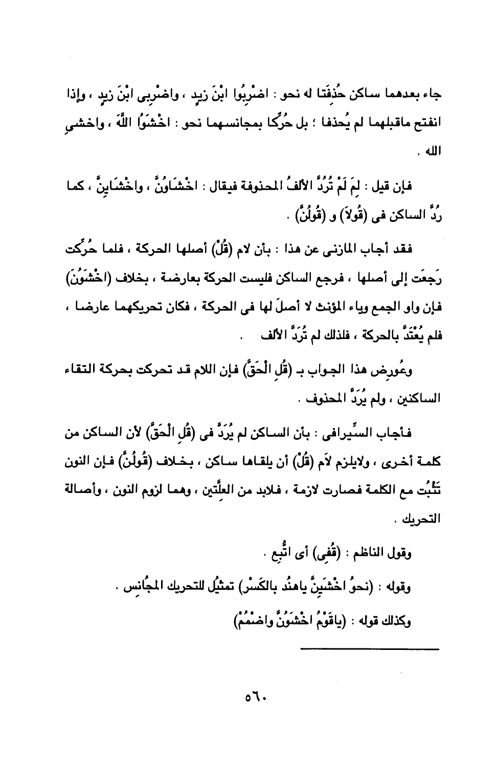 فأجاب السيرافي: بأن الساكن لم يرد في (قل الحق) لأن الساكن من كلمة أخرى، ولا يلزم لام (قل) أن يلقاها ساكن، بخلاف (قولن) فإن النون تثبت مع الكلمة فصارت لازمة، فلابد من العلتين، وهما لزوم النون، وأصالة التحريك.