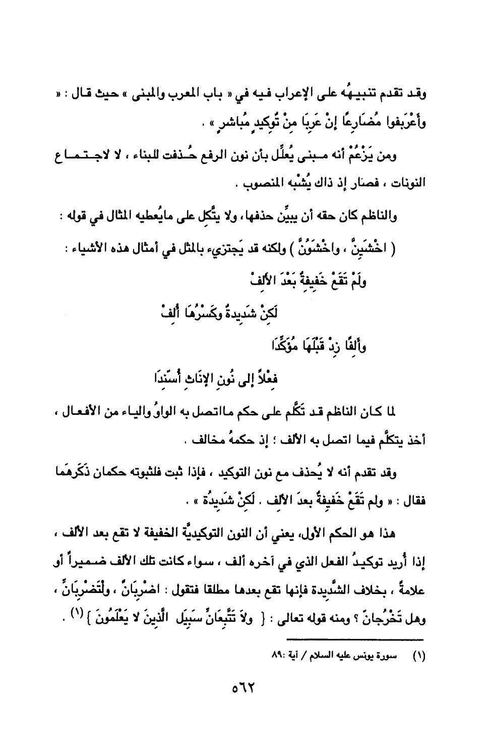 هذا هو الحكم الأول، يعني أن النون التوكيدية الخفيفة لا تقع بعد الألف، إذا أريد توكيد الفعل الذي في آخره ألف، سواء كانت تلك الألف ضميرًا أو علامةً، بخلاف الشديدة فإنها تقع بعدها مطلقا فتقول: اضران، ولتضربان، وهل تخرجان؟ ومنه قوله تعالى: {ولا تتبعان سبيل الذين لا يعلمون}.