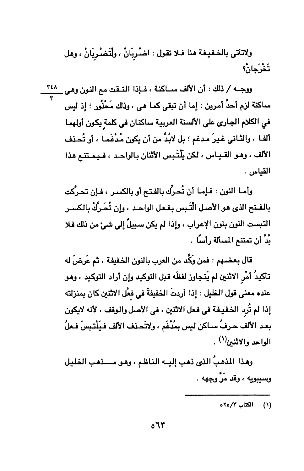 قال بعضهم: فمن وكد من العرب بالنون الخفيفة، ثم عرض له تأكيد أمر الاثنين لم يتجاوز لفظه قبل التوكيد وإن أراد التوكيد، وهو عنده معنى قول الخليل: إذا أردت الخفيفة في فعل الاثنين كان بمنزلته إذا لم ترد الخفيفة في فعل الاثنين، في الأصل والوقف، لأنه لا يكون بعد الألف حرف ساكن ليس بمدغم، ولا تحذف الألف فيلتبس فعل الواحد والاثنين.