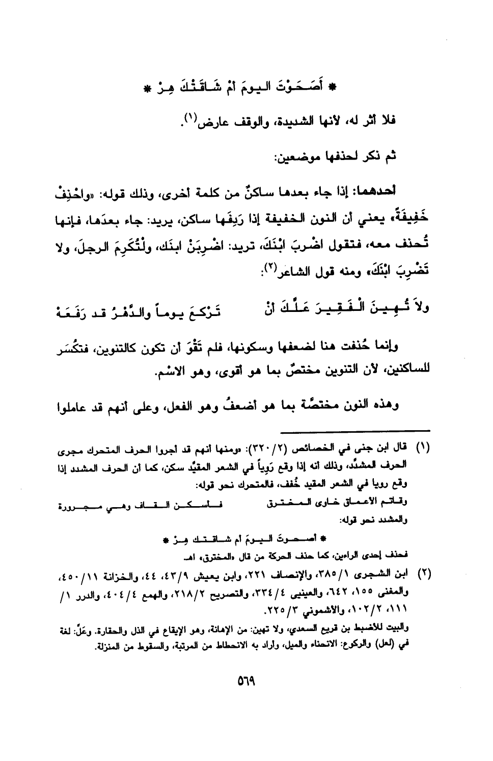أحدهما: إذا جاء بعدها ساكن من كلمة أخرى، وذلك قوله: "واحذف خفيفة" يعني أن النون الخفيفة إذا ردفها ساكن، يريد: جاء بعدها، فإنها تحذف معه، فتقول اضرب ابنك، تريد: اضربن ابنك، ولتكرم الرجل، ولا تضرب ابنك" ومنه قول الشاعر: