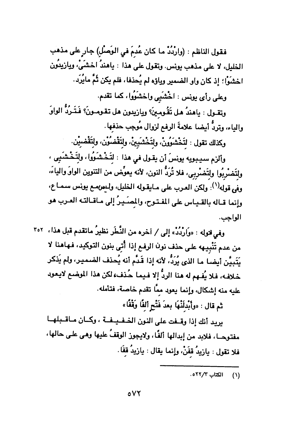 فقول الناظم: (واردد ما كان عدم في الوصل) جارٍ على مذهب الخليل، لا على مذهب يونس. وتقول على هذا: يا هند اخشي، ويا زيدون اخشوا؛ إذ كان واو الضمير وياؤه لم يحذفا، فلم يكن ثم ما يرد.