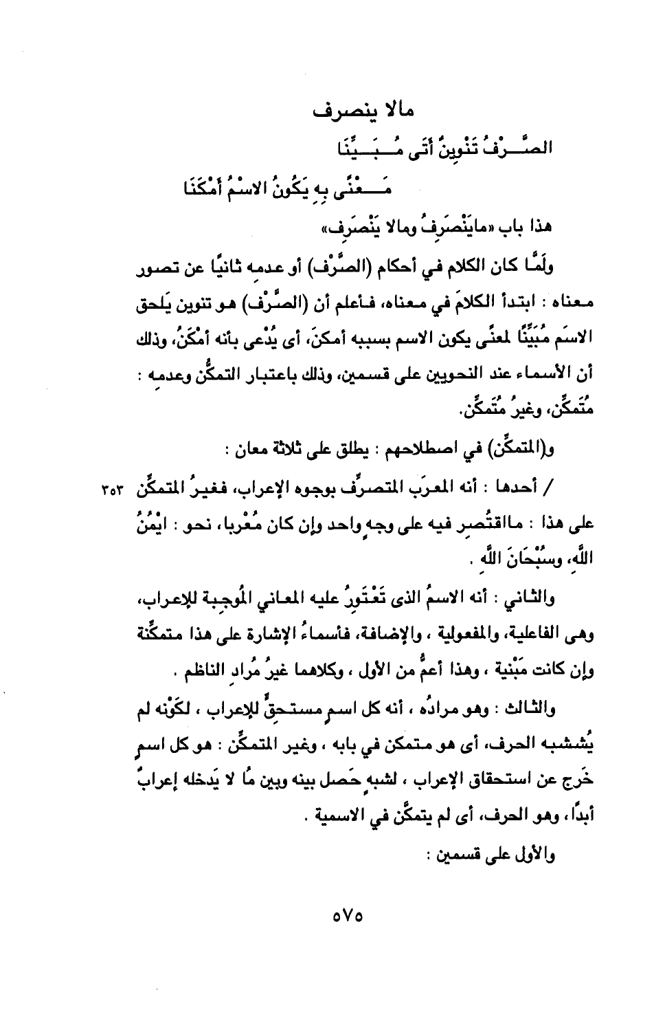 ولما كان الكلام في أحكام (الصرف) أو عدمه ثانيًا عن تصور معناه: ابتدأ الكلام في معناه، فاعلم أن (الصرف) هو تنوين يلحق الاسم مبينًا لمعنًى يكون الاسم بسببه أمكن، أي يدعى بأنه أمكن، وذلك أن الأسماء عند النحويين على قسمين، وذلك باعتبار التمكن وعدمه: متمكن، وغير متمكن.
