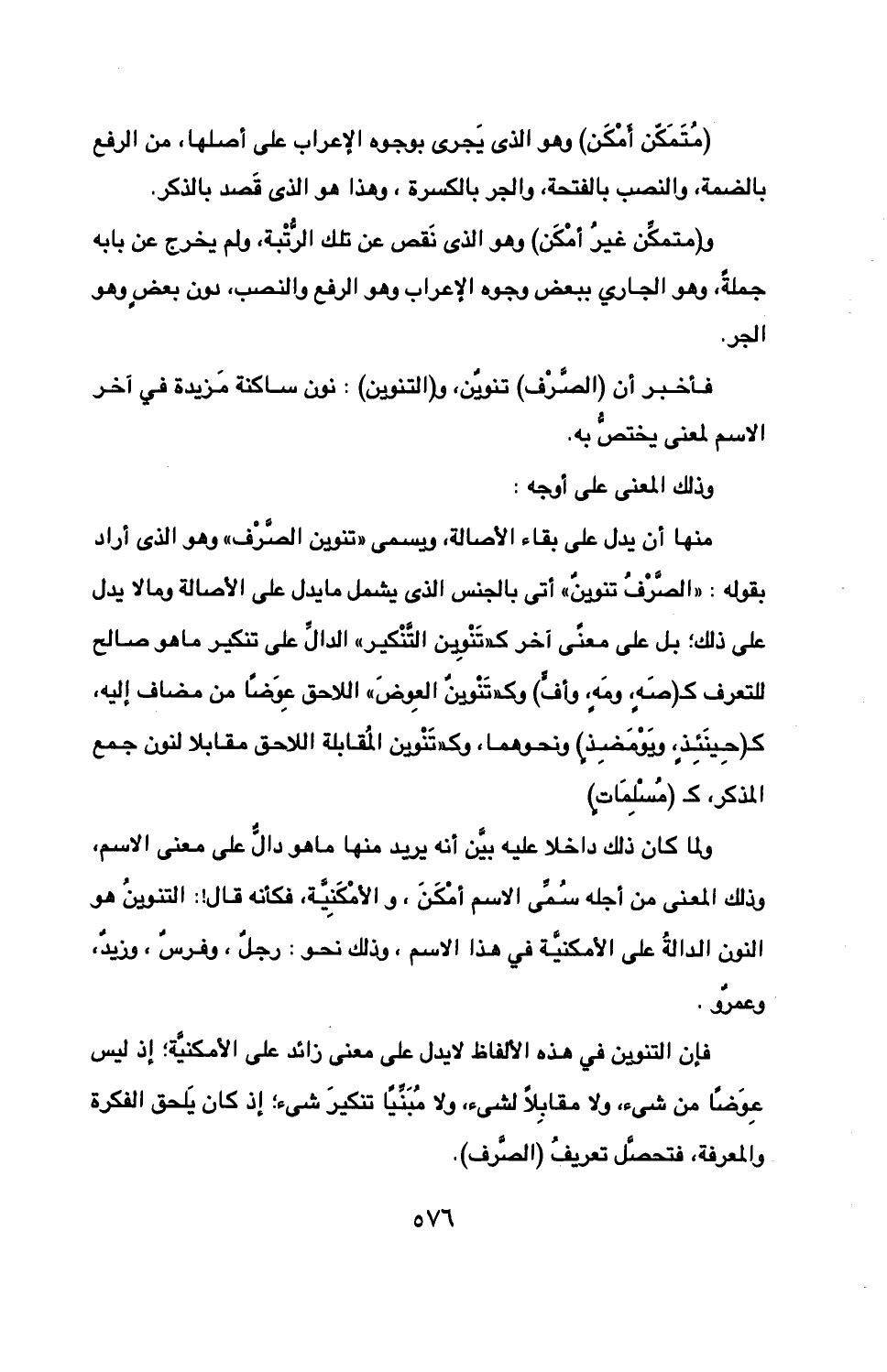 منها أن يدل على بقاء الأصالة، ويسمى "تنوين الصرف" وهو الذي أراد بقوله: "الصرف تنوين" أتى بالجنس الذي يشمل ما يدل على الأصالة وما لا يدل على ذلك؛ بل على معنى آخر كـ "تنوين التنكير" الدال على تنكير ما هو صالح للتعرف كـ (صه، ومه، وأف) وكـ "تنوين العوض" اللاحق عوضًا من مضاف إليه، كـ (حينئذ، ويومئذ) ونحوهما، وكـ "تنوين المقابلة اللاحق مقابلا لنون جمع المذكر، كـ (مسلمات)