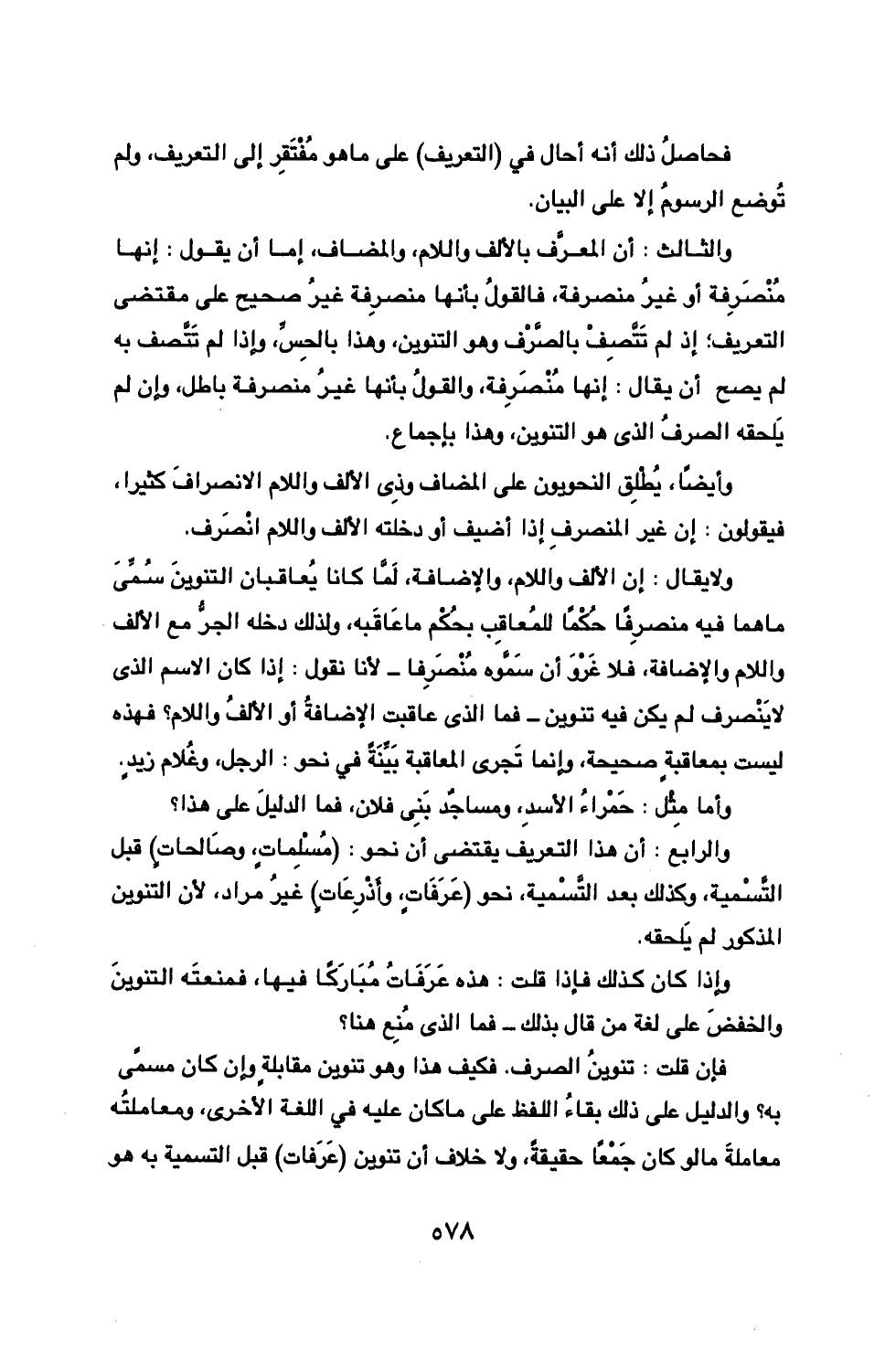 والثالث: أن المعرف بالألف واللام، والمضاف، إما أن يقول: إنها منصرفة أو غير منصرفة، فالقول بأنها منصرفة غير صحيح على مقتضى التعريف؛ إذ لم تتصف بالصرف وهو التنوين، وهذا بالحس، وإذا لم تتصف به لم يصح أن يقال: إنها منصرفة، والقول بأنها غير منصرفة باطل، وإن لم يلحقه الصرف الذي هو التنوين، وهذا بإجماع.