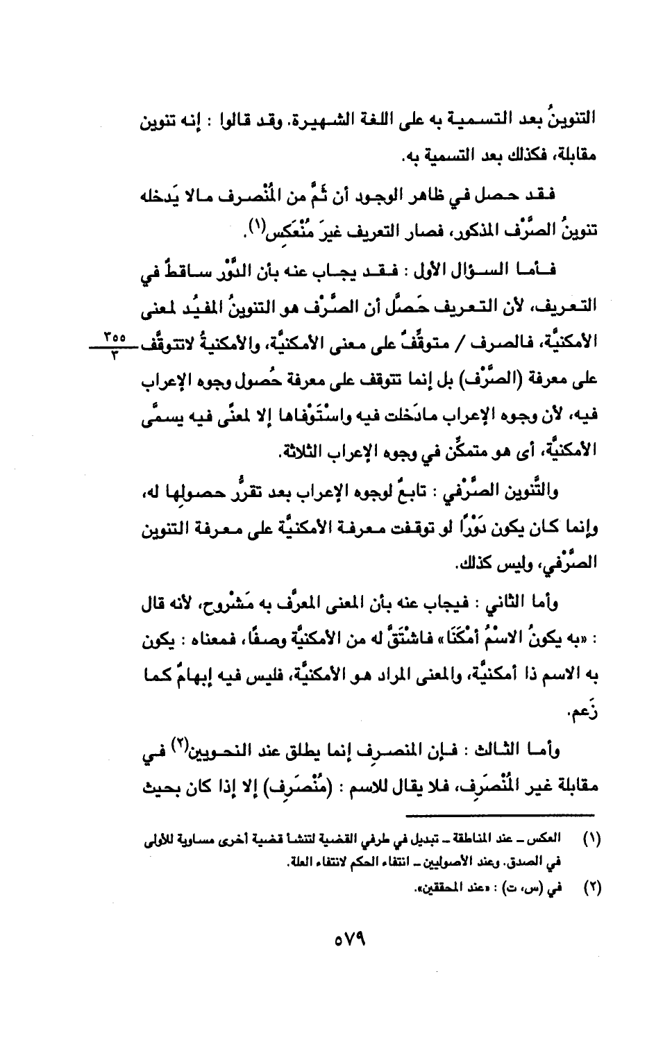 فأما السؤال الأول: فقد يجاب عنه بأن الدور ساقط في التعريف، لأن التعريف حصل أن الصرف هو التنوين المفيد لمعنى الأمكنية، فالصرف متوقف على معنى الأمكنية، والأمكنية لا تتوقف على معرفة (الصرف) بل إنما تتوقف على معرفة حصول وجوه الإعراب فيه، لأن وجوه الإعراب ما دخلت فيه واستوفاها إلا لمعنى فيه يسمى الأمكنية، أي هو متمكن في وجوه الإعراب الثلاثة.