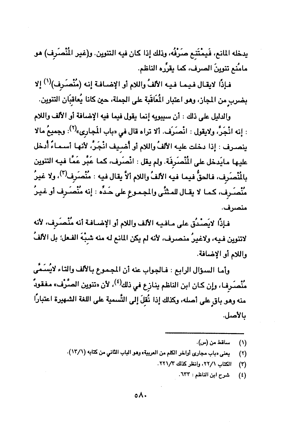 وأما السؤال الرابع: فالجواب عنه أن المجموع بالألف والتاء لا يسمى منصرفا، وإن كان ابن النظام ينازع في ذلك، لأن "تنوين الصرف" مفقود منه وهو باقٍ على أصله، وكذلك إذا نقل إلى التسمية على اللغة الشهيرة اعتبارًا بالأصل.