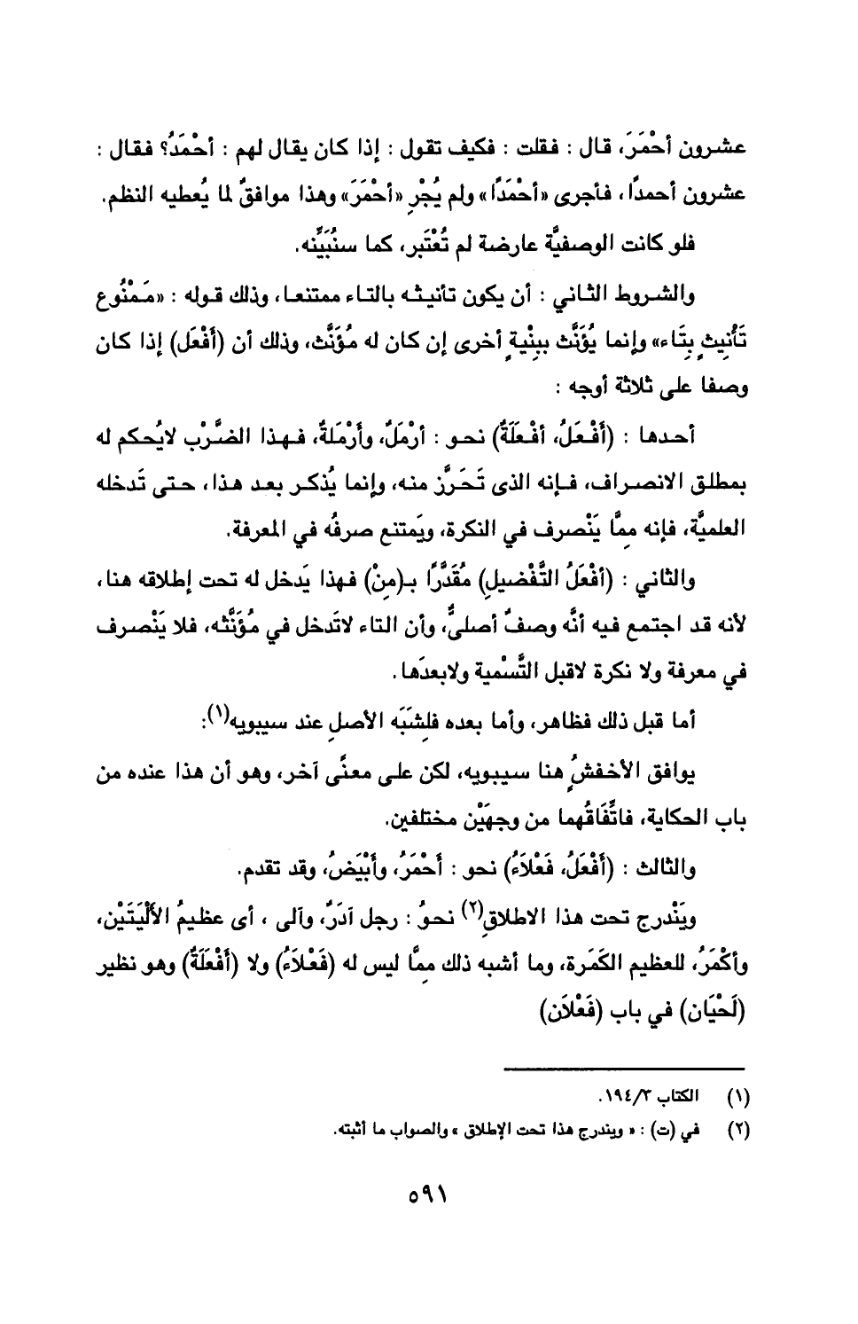 عشرون أمر، قال: فقلت: فكيف تقول: إذا كان يقال لهم: أحمد؟ فقال: عشرون أحمدًا، فأجرى "أحمدًا" ولم يجر "أحمر" وهذا موافق لما يعطيه النظم.