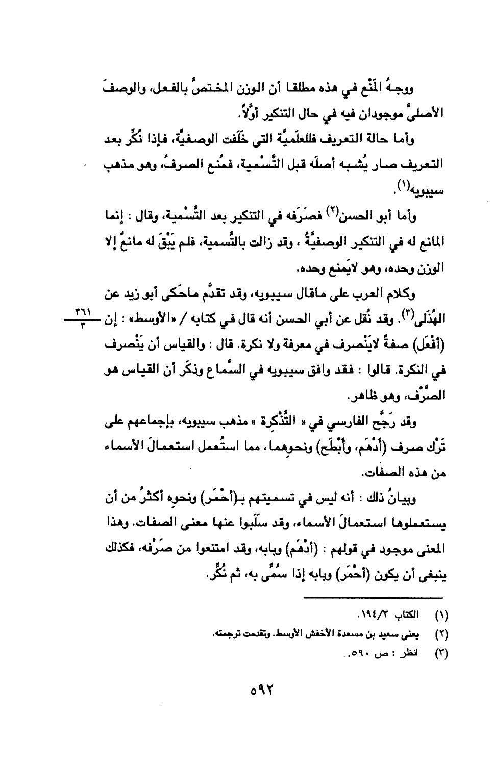 وقد رجح الفارسي في "التذكرة" مذهب سيبويه، بإجماعهم على ترك صرف (أدهم، وأبطح) ونحوهما، مما استعمل استعمال الأسماء من هذه الصفات.