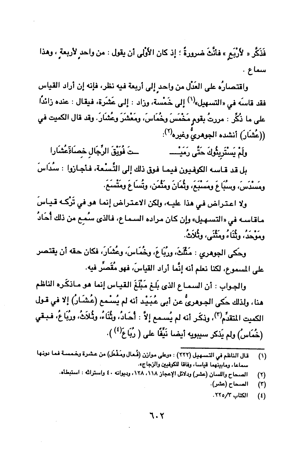 والجواب: أن السماع الذي بلغ مبلغ القياس إنما هو ما ذكره الناظم هنا، ولذلك حكى الجوهري عن أبي عبيد أنه لم يسمع (عشار) إلا في قول الكميت المتقدم، وذكر أنه لم يسمع إلا: أحاد، وثناء، وثلاث، ورباع. فبقي (خماس) ولم يذكر سيبويه أيضا نيفًا على (رباع).