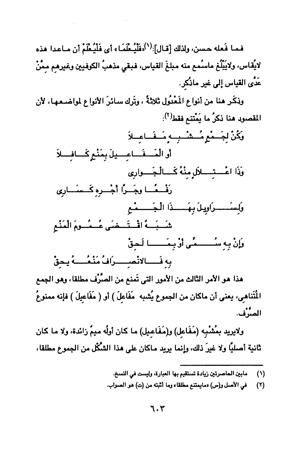 ولا يريد بمشبه (مفاعل) و (مفاعيل) ما كان أوله ميم زائدة، ولا ما كان ثانيه أصليًا ولا غير ذلك، وإنما يريد ما كان على هذا الشكل من الجموع مطلقا،