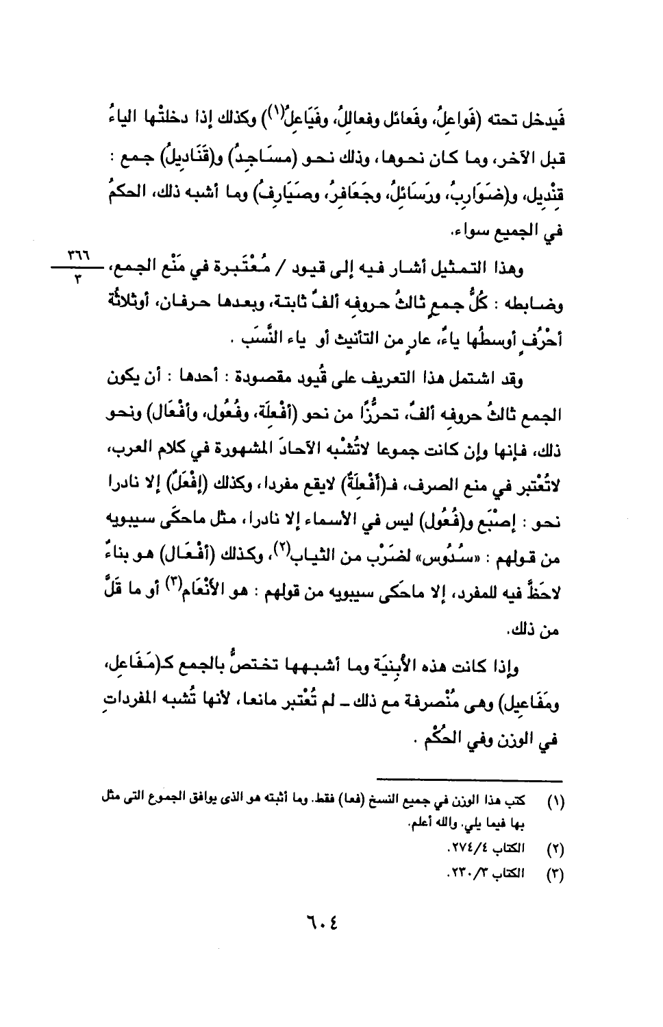 وقد اشتمل هذا التعريف على قيود مقصودة: أحدها: أن يكون الجمع ثالث حروفه ألف، تحرزًا من نحو (أفعلة، وفعول، وأفعال) ونحو ذلك، فإنها وإن كانت جموعا لا تشبه الآحاد المشهورة في كلام العرب، لا تعتبر في منع الصرف، فـ (أفعلة) لا يقع مفردا، وكذلك (إفعل) إلا ناردا نحو: إصبع و (فعول) ليس في الأسماء إلى نادرا، مثل ما حكى سيبويه من قولهم: "سدوس" لضرب من الثياب، وكذلك (أفعال) هو بناء لا حظ فيه للمفرد، إلا ما حكى سيبويه من قولهم: هو الأنعام أو ما قل من ذلك.