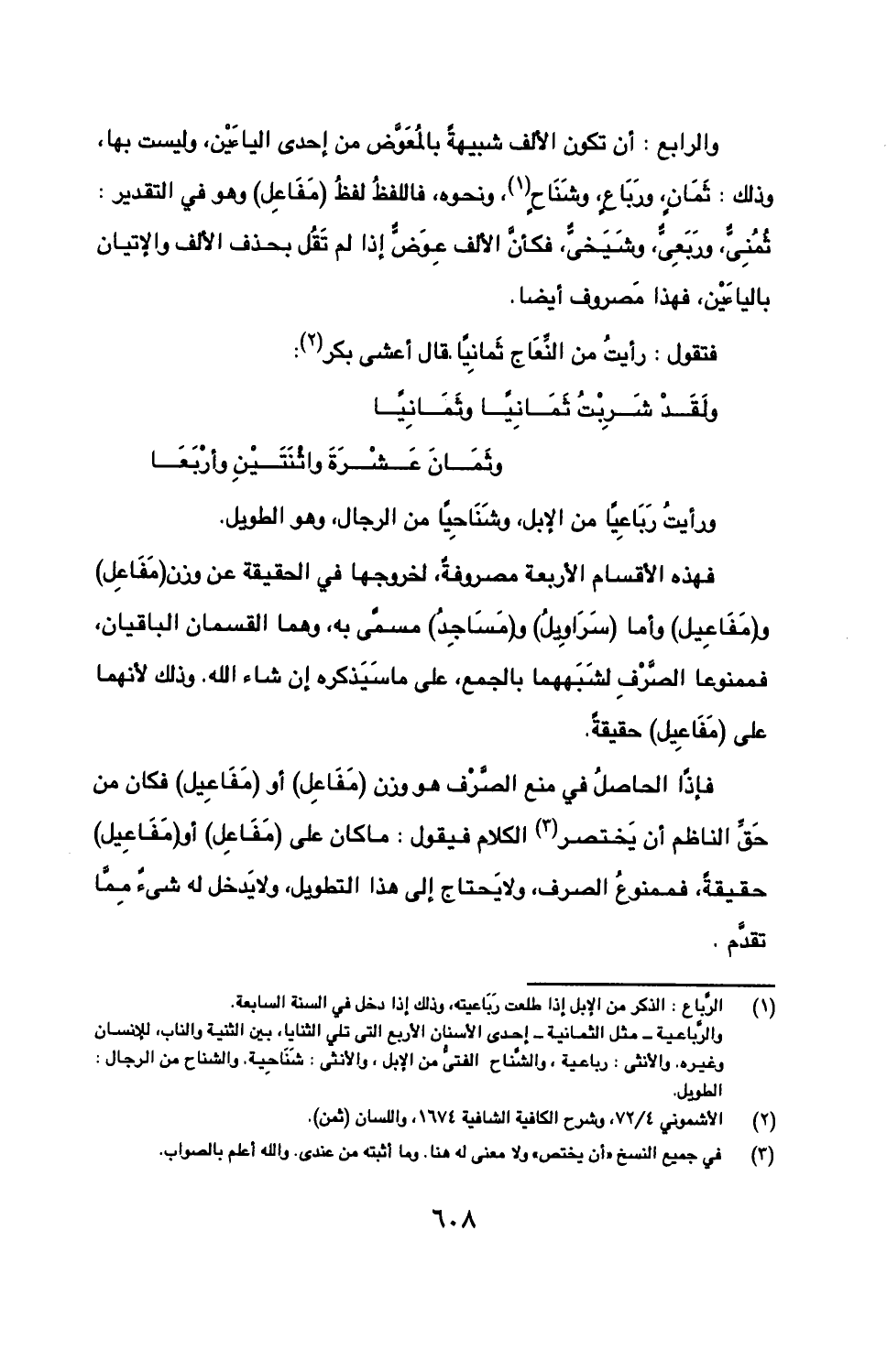 والرابع: أن تكون الألف شبيهة بالمعوض من إحدى الياءين، وليست بها، وذلك: ثمان، ورباع، وشناح، ونحوه، فاللفظ لفظ (مفاعل) وهو في التقدير: ثمني، وربعي، وشيخي، فكأن الألف عوض إذا لم تقل بحذف الألف والإتيان بالياءين، فهذا مصروف أيضا.