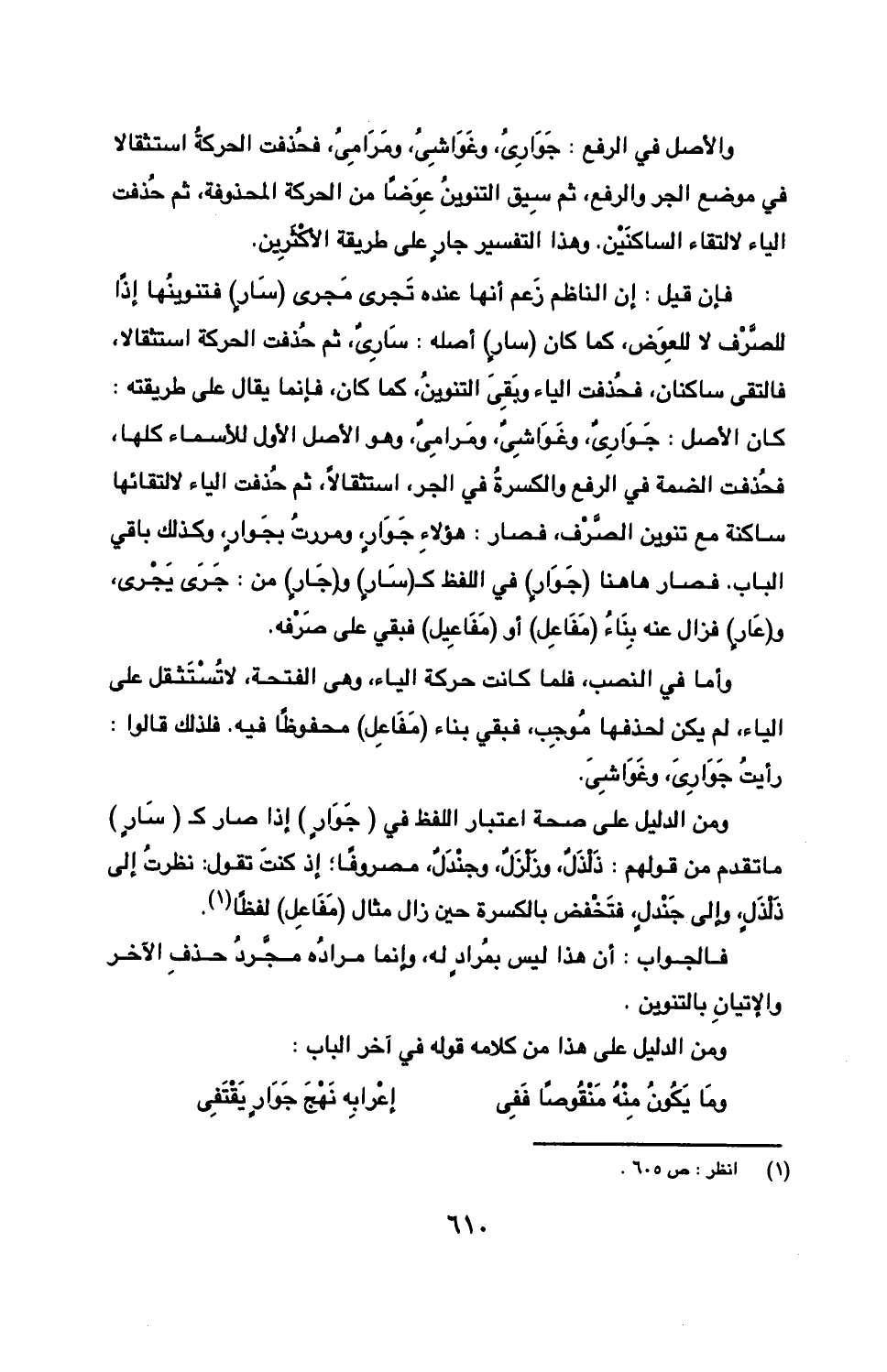 والأصل في الرفع: جواري، وغواشي، ومرامي، فحذفت الحركة استثقال في موضع الجر والرفع، ثم سيق التنوين عوضًا من الحركة المحذوفة، ثم حذفت الياء لالتقاء الساكنين. وهذا التفسير جارٍ على طريقة الأكثرين.