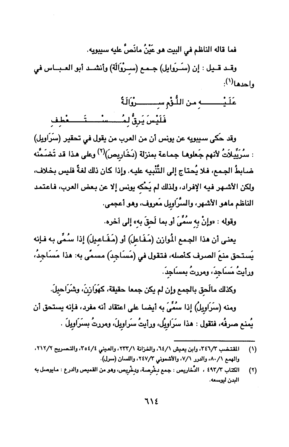 وقد حكى سيبويه عن يونس أن من العرب من يقول في تحقير (سراويل): سرييلات لأنهم جعلوها جماعة بمنزلة (دخاريص) وعلى هذا قد تضمنه ضابط الجمع، فلا يحتاج إلى التنبيه عليه. وإذ كان ذلك لغةً فليس بخلاف، ولكن الأشهر فيه الإفراد، ولذلك لم يحكه يونس إلا عن بعض العرب، فاعتمد الناظم ما هو الأشهر، والسراويل معروف، وهو أعجمي.