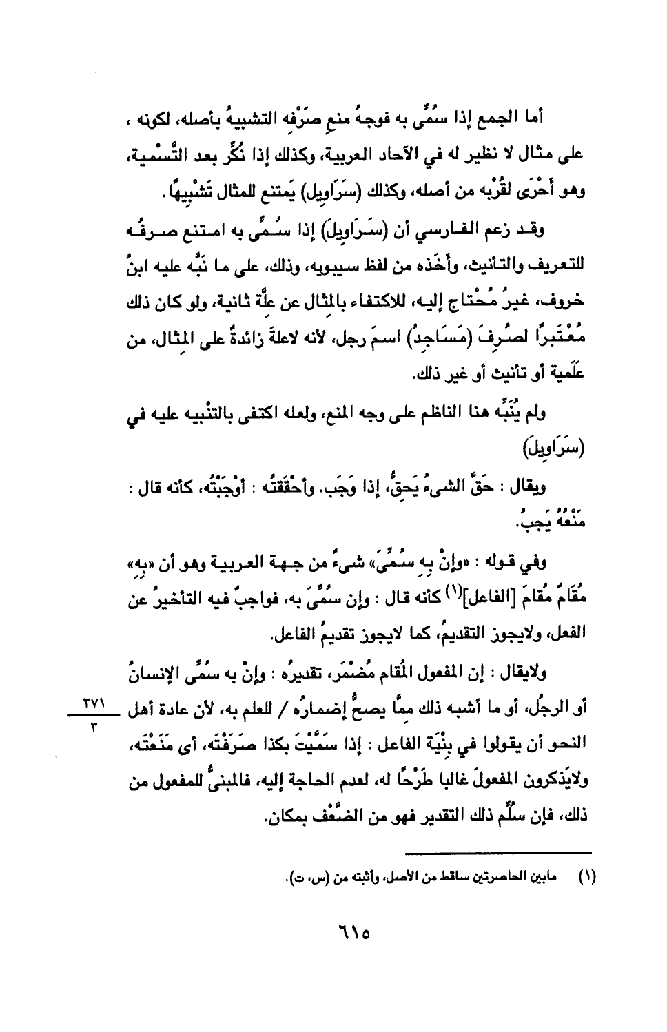 أما الجمع إذا سمي به فوجه منع صرفه التشبيه بأصله، لكونه، على مثال لا نظير له في الآحاد العربية، وكذلك إذا نكر بعد التسمية، وهو أحرى لقربه من أصله، وكذلك (سراويل) يمتنع للمثال تشبيهًا.