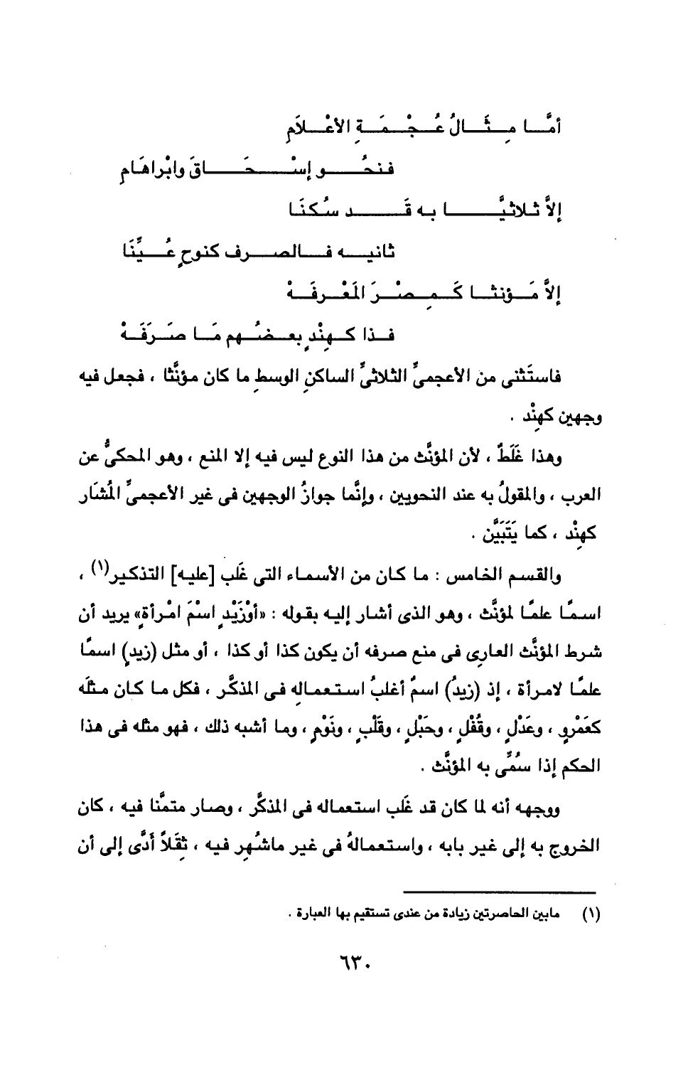 والقسم الخامس: ما كان من الأسماء التي غلب [عليه] التذكير، اسمًا علمًا لمؤنث، وهو الذي أشار إليه بقوله: "أوزيد اسم امرأة" يريد أن شرط المؤنث العاري في منع صرفه أن يكون كذا أو كذا، أو مثل (زيد) اسمًا علمًا لامرأة، إذ (زيد) اسم أغلب استعماله في المذكر، فكل ما كان مثله كعمرو، وعدل، وقفل، وحبل، وقلب، ونوم، وما أشبه ذلك، فهو مثله في هذا الحكم إذا سمي به المؤنث.
