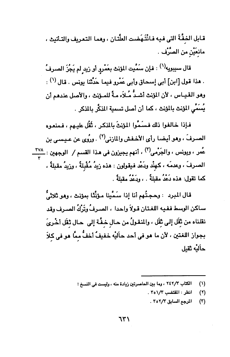 فإذا خالفوا ذلك فسموا المؤنث بالمذكر، ثقل عليهم، فمنعوه الصرف، وهو أيضا رأي الأخفش والمازني. وروي عن عيسى بن عمر، ويونس، والجرمي، أنهم يجيزون في هذا القسم الوجهين: الصرف، وعدمه، كهند ودعد فيقولون: هذه زيدُ مقبلةَ، وزيدُ مقبلةً، كما تقول: هذه دعدُ مقبلةً، ودعدٌ مقبلةً.