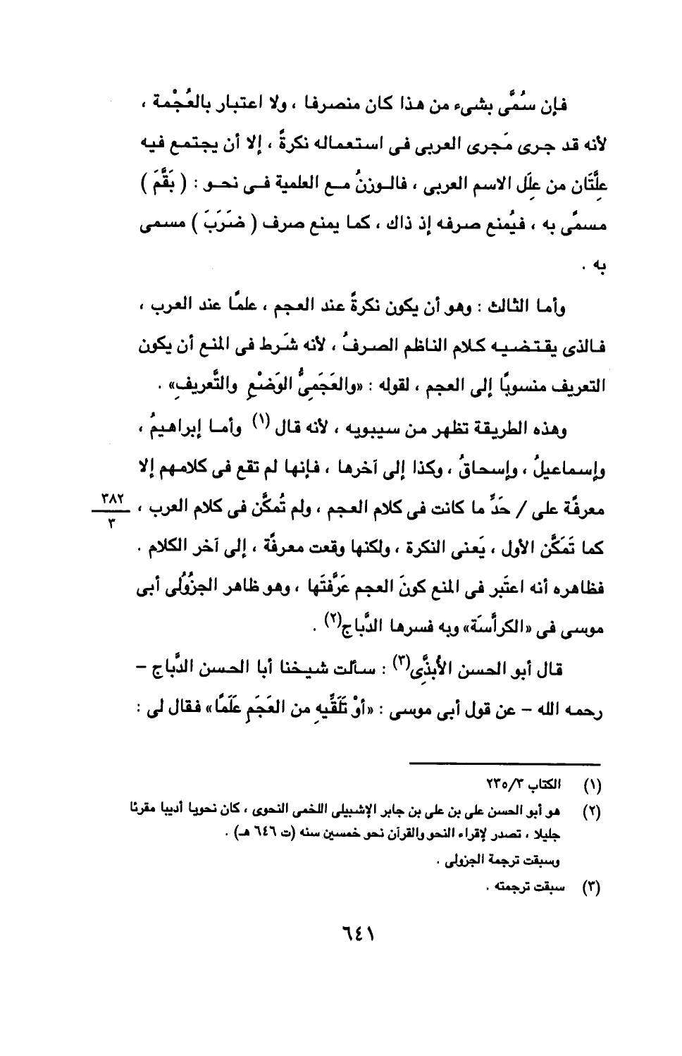وهذه الطريقة تظهر من سيبويه، لأنه قال وأما إبراهيم، وإسماعيل، وإسحاق، وكذا إلى آخرها، فإنها لم تقع في كلامهم إلا معرفة على حد ما كانت في كلام العجم، ولم تمكن في كلام العرب، كما تمكن الأول، يعني النكرة، ولكنها وقعت معرفة، إلى آخر الكلام. فظاهره أنه اعتبر في المنع كون العجم عرفتها، وهو ظاهر الجزولي أبي موسى في "الكراسة" وبه فسرها الدباج.