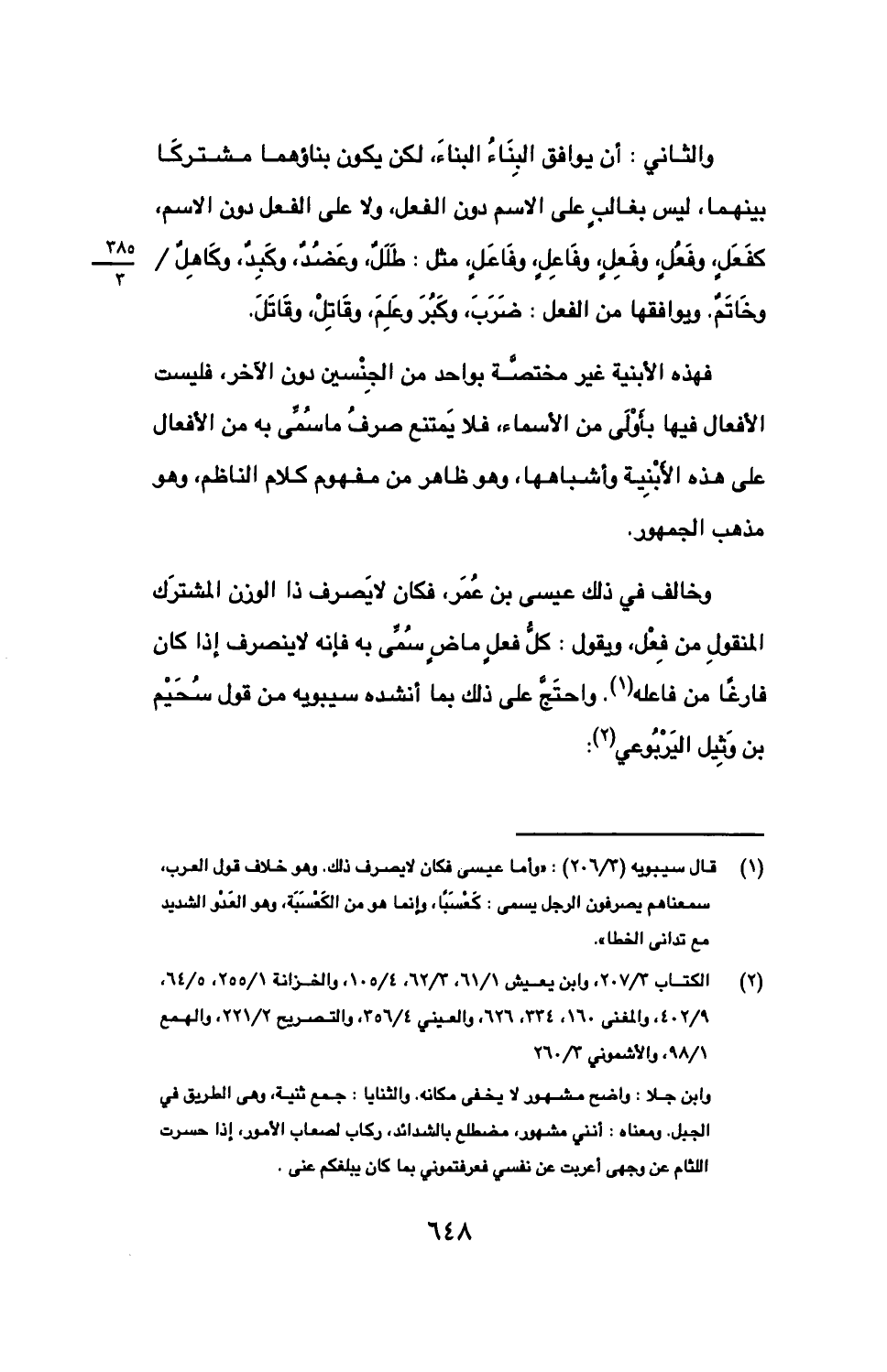 والثاني: أن يوافق البناء البناء، لكن يكون بناؤهما مشتركًا بينهما، ليس بغالب على الاسم دون الفعل، ولا على الفعل دون الاسم، كفعلٍ، وفعلٍ، وفعلٍ، وفاعلٍ، وفاعل، مثل: طلل، وعضد، وكبد، وكاهل وخاتم، ويوافقها من الفعل: ضرب، وكبر وعلم، وقاتل، وقاتل.