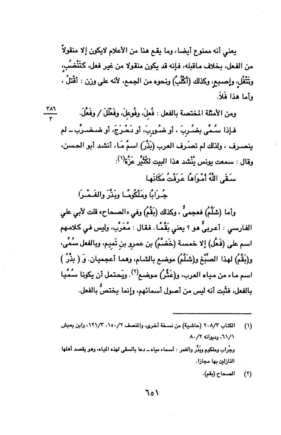وأما (شلم) فعجمي، وكذلك (بقم) وفي "الصحاح" قلت لأبي علي الفارسي: أعربي هو؟ يعني بقمًا. فقال: عرب، وليس في كلامهم اسم على (فعل) إلا خمسة (خضم) بن عمرو بن تميم، وبالفعل سمي، و (بقم) لهذا الصبغ و (شلم) موضع بالشام، وهما أعجميان. و (بذر) اسم ماء من مياه العرب، و (عثر) موضع. ويحتمل أن يكونا سميا بالفعل، فثبت أنه ليس من أصول أسمائهم، وإنما يختص بالفعل.