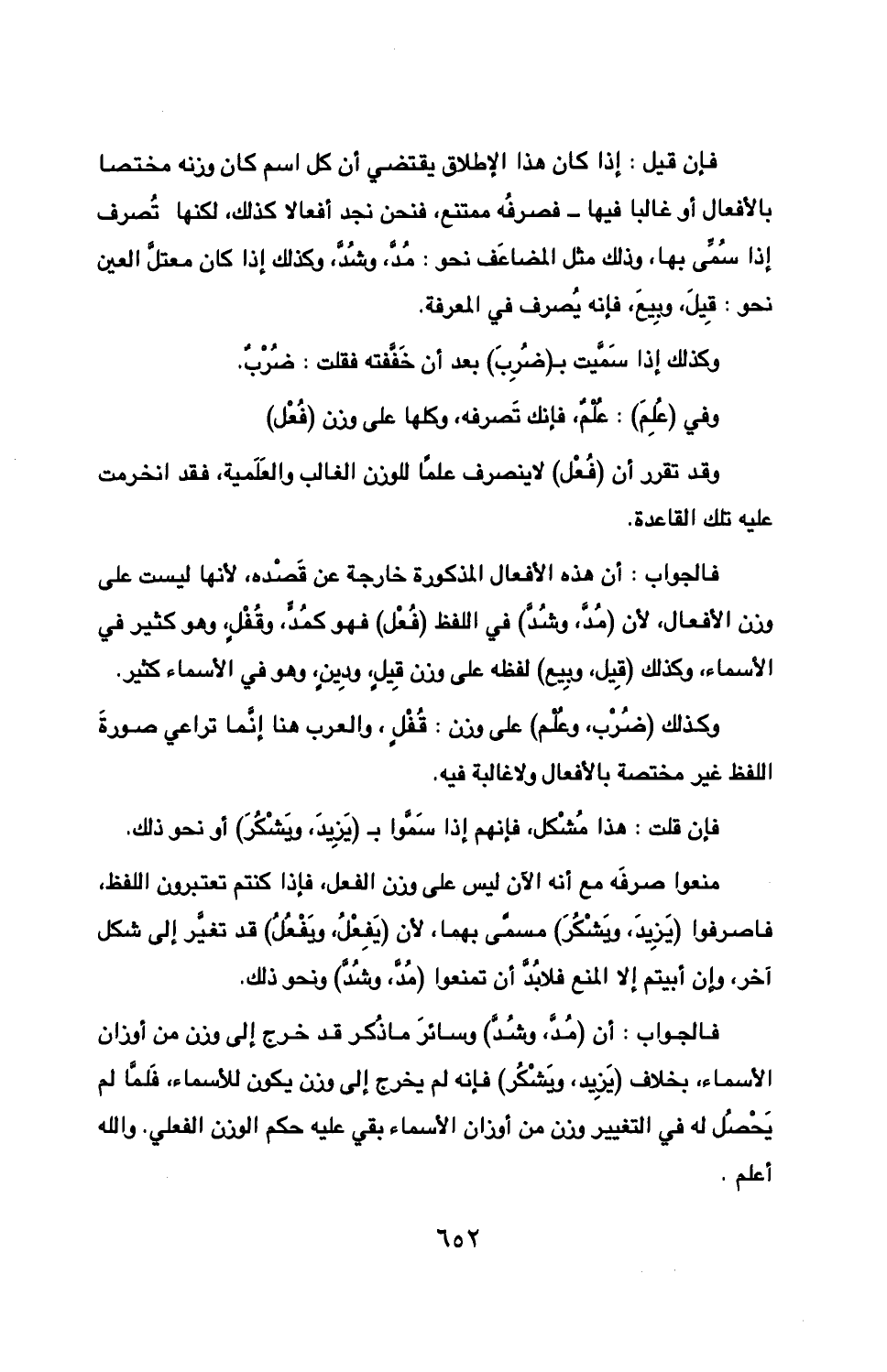 فإن قيل: إذا كان هذا الإطلاق يقتضي أن كل اسم كان وزنه مختصا بالأفعال أو غالبا فيها- فصرفه ممتنع، فنحن نجد أفعالا كذلك، لكنها تصرف إذا سمي بها، وذلك مثل المضاعف نحو: مد، وشد، وكذلك إذا كان معتل العين نحو: قيل، وبيع، فإنه يصرف في المعرفة.