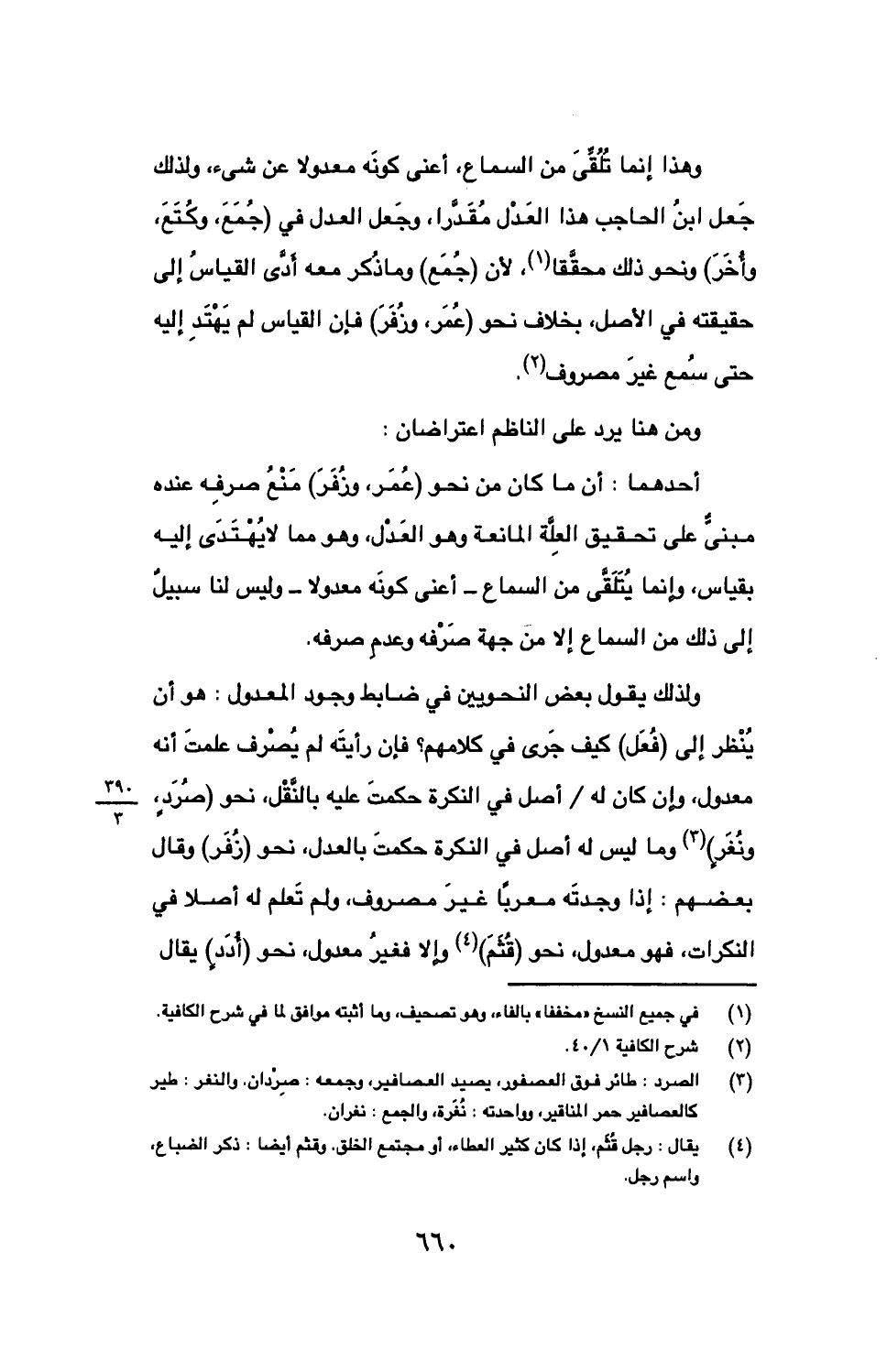 أحدهما: أن ما كان من نحو (عمر، وزفر) منع صرفه عنده مبني على تحقيق العلة المانعة وهو العدل، وهو مما لا يهتدي إليه بقياس، وإنما يتلقى من السماع- أعني كونه معدولا- وليس لنا سبيل إلى ذلك من السماع إلا من جهة صرفه وعدم صرفه.