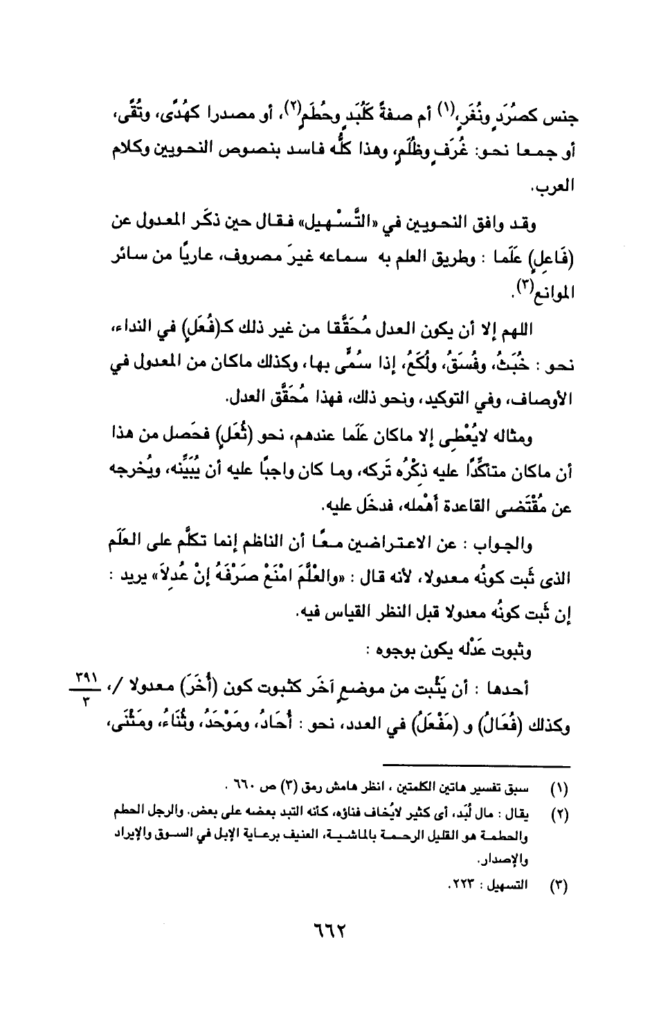 والجواب: عن الاعتراضيين معًا أن الناظم إنما تكلم على العلم الذي ثبت كونه معدولا، لأنه قال: "والعلم امنع صرفه إن عدلا" يريد": إن ثبت كونه معدولا قبل النظر القياس فيه.