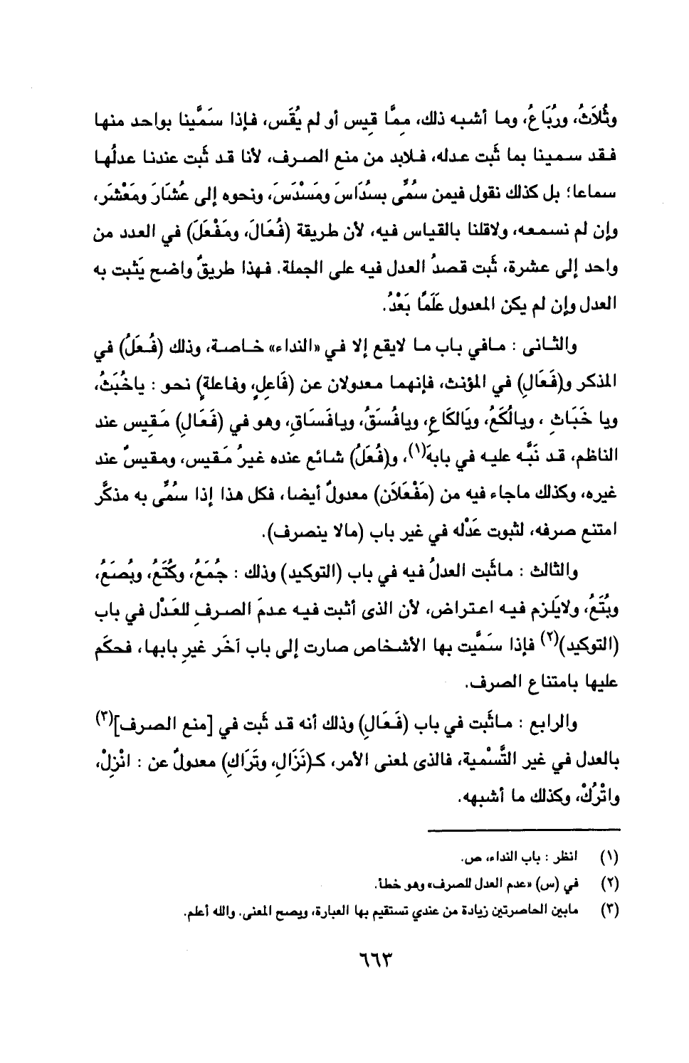 والثالث: ما ثبت العدل فيه في باب (التوكيد) وذلك: جُمع، وكُتَع، وبُصع، وبُتع، ولا يلزم فيه اعتراض، لأن الذي أثبت فيه عدم الصرف للعدل في باب (التوكيد) فإذا سميت بها الأشخاص صارت إلى باب آخر غير بابها، فحكم عليها بامتناع الصرف.