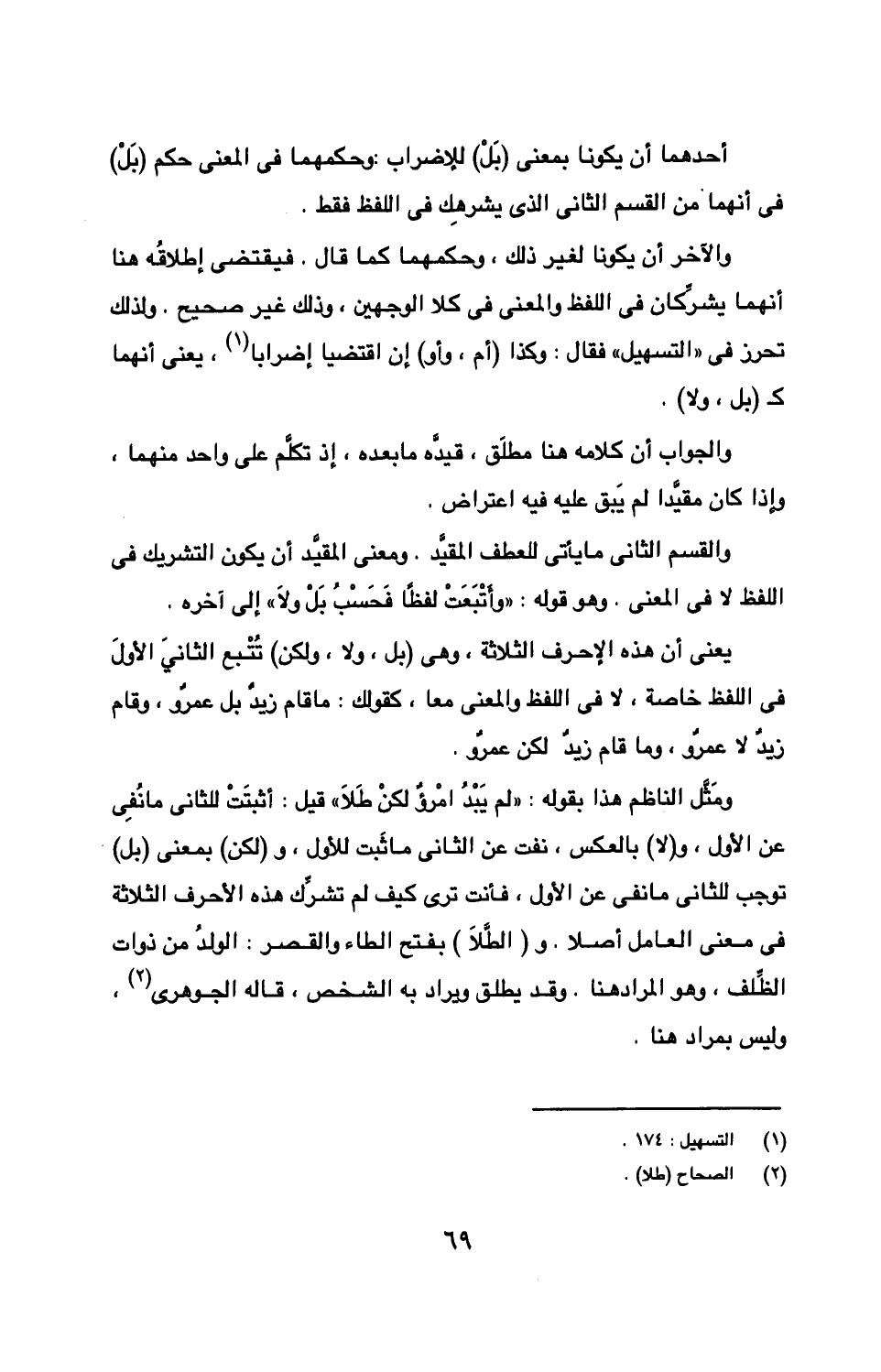ومثل الناظم هذا بقوله: "لم يبد امرؤ لكن طلا" قيل: أثبتت للثاني ما نفي عن الأول، و (لا) بالعكس، نفت عن الثاني ما ثبت الأول، و (لكن) بمعنى (بل) توجب للثاني ما نفي عن الأول، فأنت ترى كيف لم تشرك هذه الأحرف الثلاثة في معنى العامل أصلًا. و (الطلا) بفتح الطاء ولقصر: الولد من ذوات الظلف، وهو المراد هنا. وقد يطلق ويراد به الشخص، قاله الجوهري، وليس بمراد هنا.