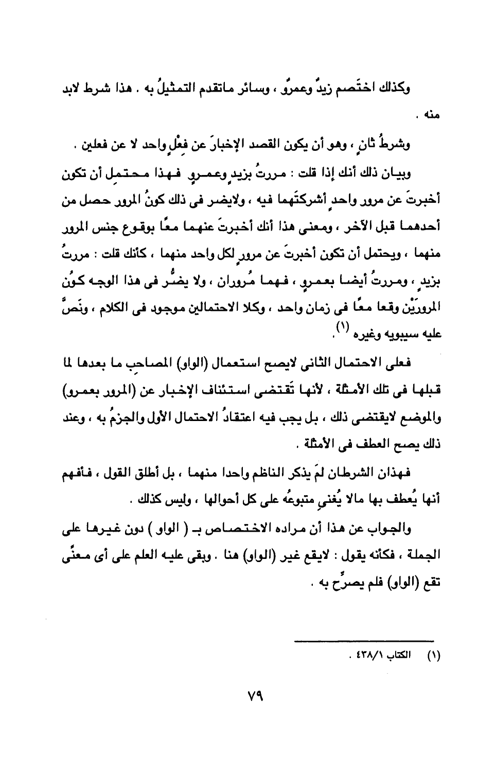 فعلى الاحتمال الثاني لا يصح استعمال (الواو) المصاحب ما بعدها لما قبلها في تلك الأمثلة، لأنها تقتضي استئناف الإخبار عن (المرور بعمرو) والموضع لا يقتضي ذلك، بل يجب فيه اعتقاد الاحتمال الأول والجزم به، وعند ذلك يصح العطف في الأمثلة.