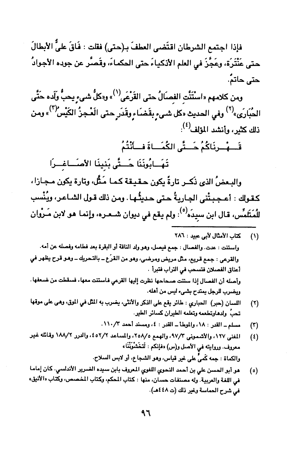 ومن كلامهم "استنت الفصال حتى ألقرعي" و "كل شيء يحب ولده حتى الحباري" وفي الحديث "كل شيءٍ بقضاءٍ وقدرٍ حتى العجز الكيس" ومن ذلك كثير، وأنشد المؤلف:
