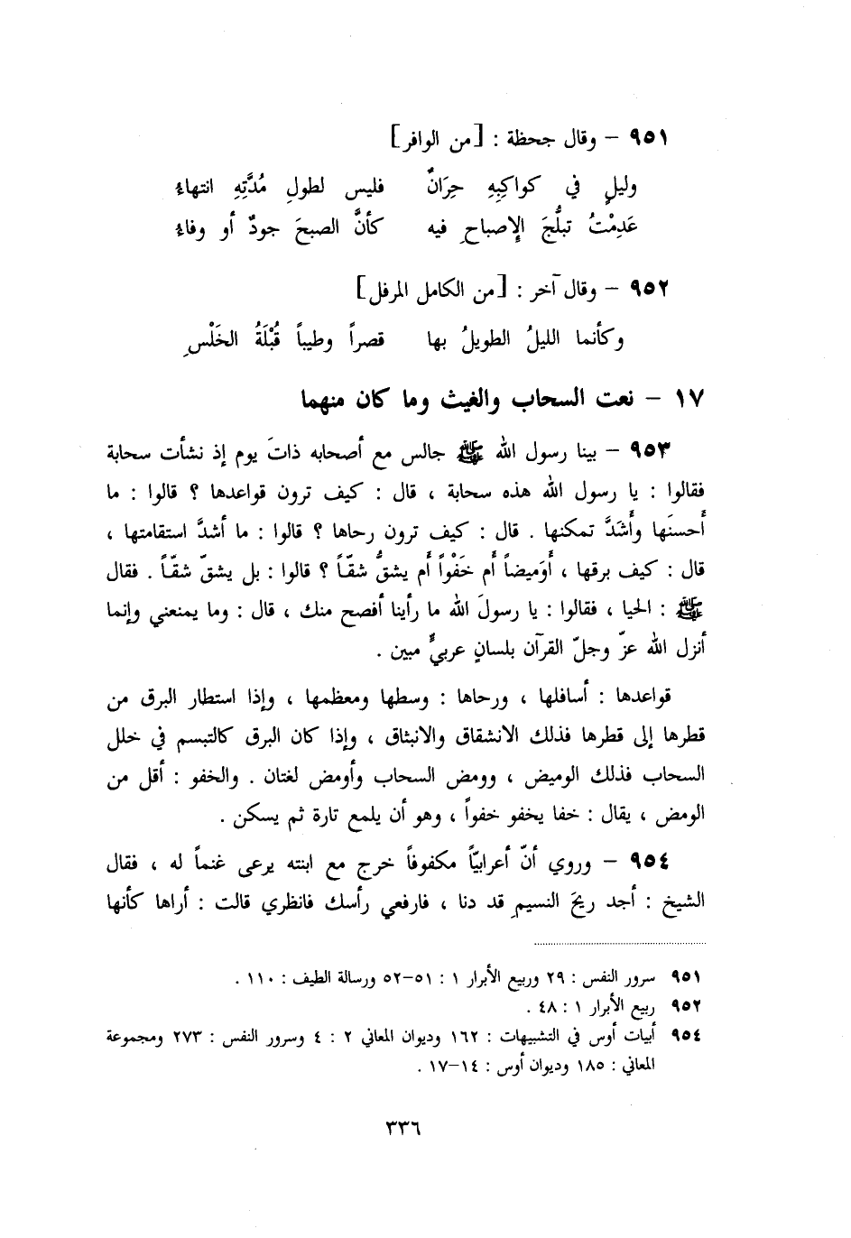 «954» - وروي أنّ أعرابيّا مكفوفا خرج مع ابنته يرعى غنما له، فقال الشيخ: أجد ريح النسيم قد دنا، فارفعي رأسك فانظري قالت: أراها كأنها