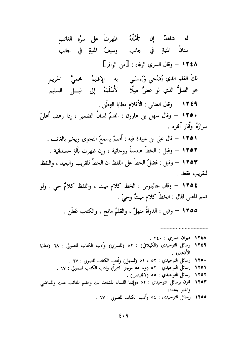 «1250» - وقال سهل بن هارون: القلم لسان الضمير، إذا رعف أعلن سراره وأنار آثاره.