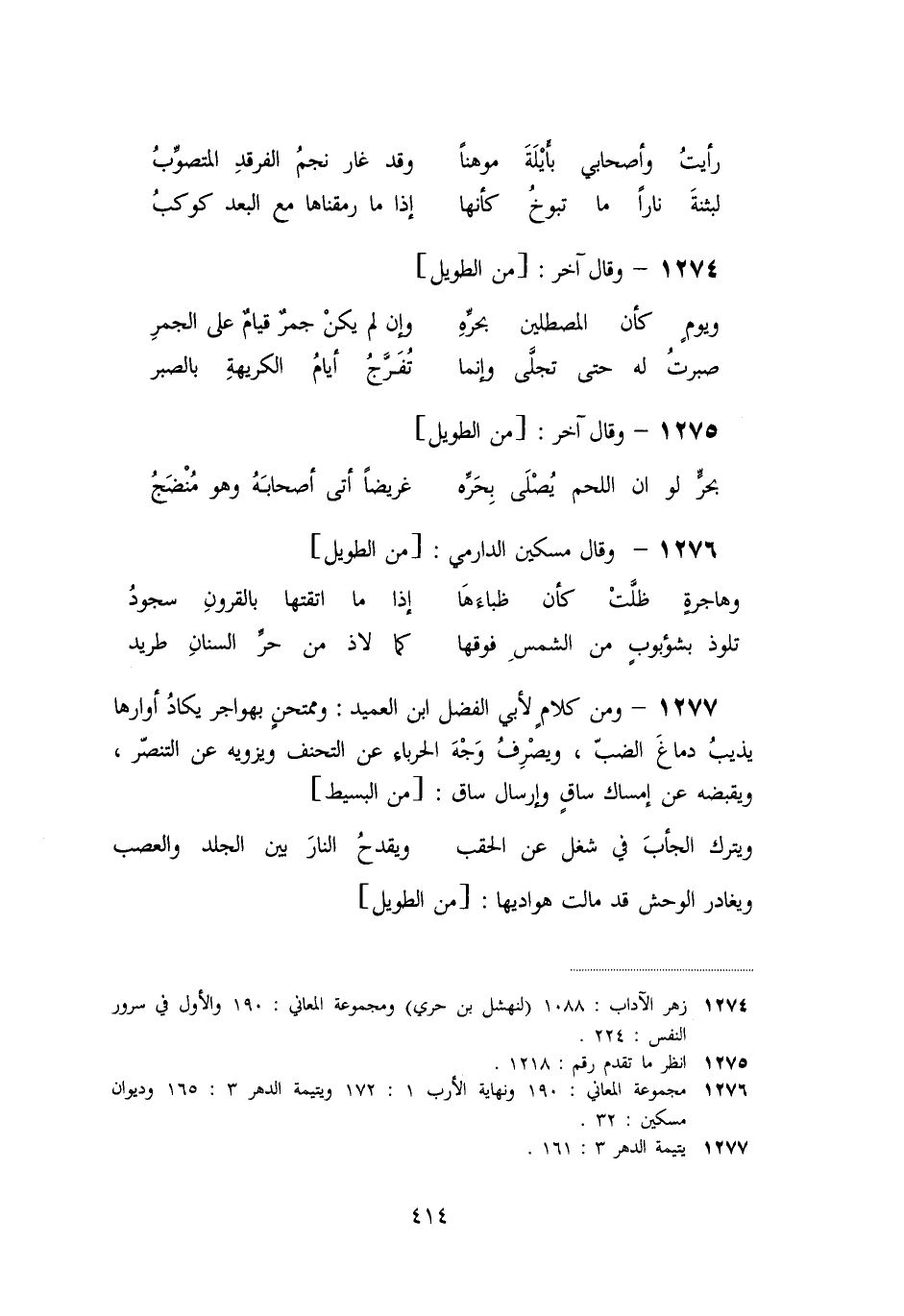 «1277» - ومن كلام لأبي الفضل ابن العميد: وممتحن بهواجر يكاد أوارها يذيب دماغ الضبّ، ويصرف وجه الحرباء عن التحنف ويزويه عن التنصّر، ويقبضه عن إمساك ساق وإرسال ساق: [من البسيط]