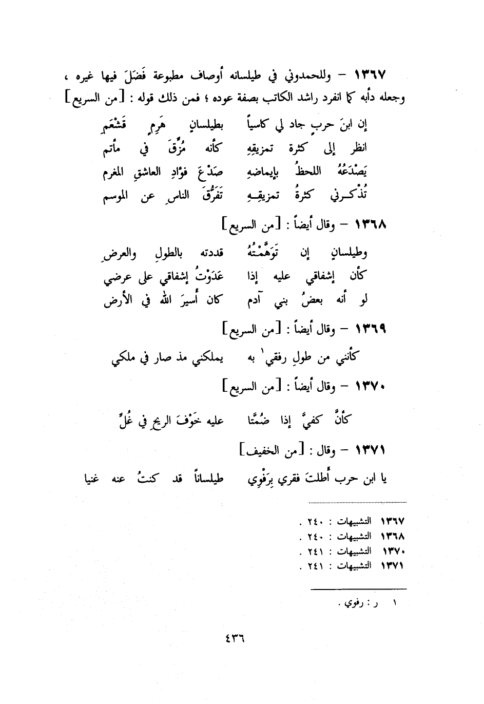 «1367» - وللحمدوني في طيلسانه أوصاف مطبوعة فضل فيها غيره، وجعله دأبه كما انفرد راشد الكاتب بصفة عوده؛ فمن ذلك قوله: [من السريع]