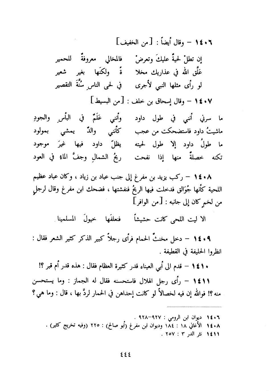 «1408» - ركب يزيد بن مفرغ إلى جنب عباد بن زياد، وكان عباد عظيم اللحية كأنها جوالق فدخلت فيها الريح فنفشتها، فضحك ابن مفرغ وقال لرجل من لخم كان إلى جانبه: [من الوافر]