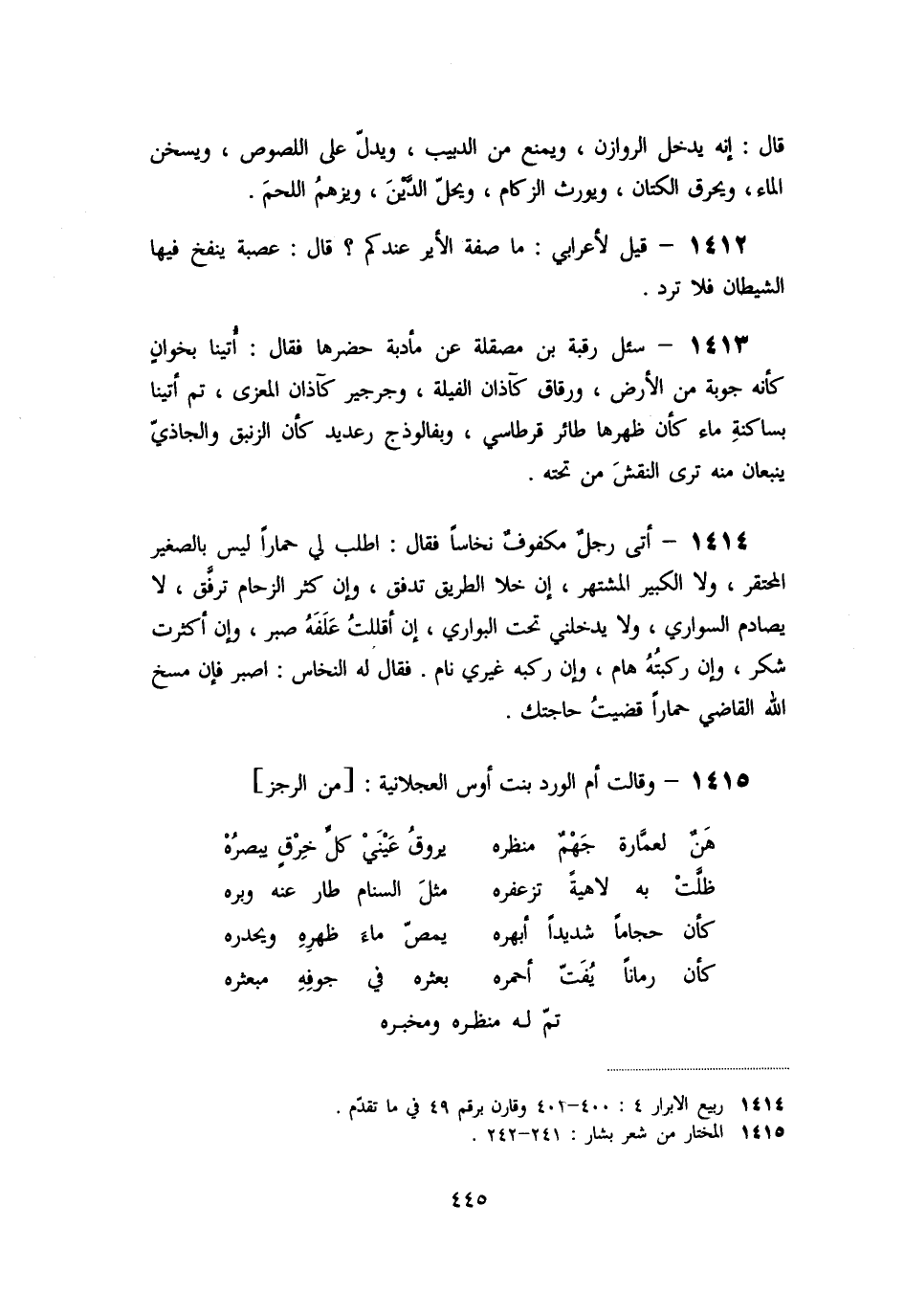 1412- قيل لأعرابي: ما صفة الأير عندكم؟ قال: عصبة ينفخ فيها الشيطان فلا ترد.