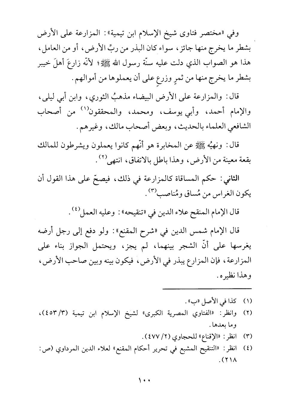 وفي "مختصر فتاوى شيخ الإسلام ابن تيمية": المزارعة على الأرض بشطر ما يخرج منها جائز، سواء كان البذر من ربِّ الأرض، أو من العامل، هذا هو الصواب الذي دلت عليه سنّة رسول الله - صلى الله عليه وسلم -؛ لأنّه زارعَ أهلَ خيبر بشطر ما يخرج منها من ثمرٍ وزرعٍ على أن يعملوها من أموالهم.