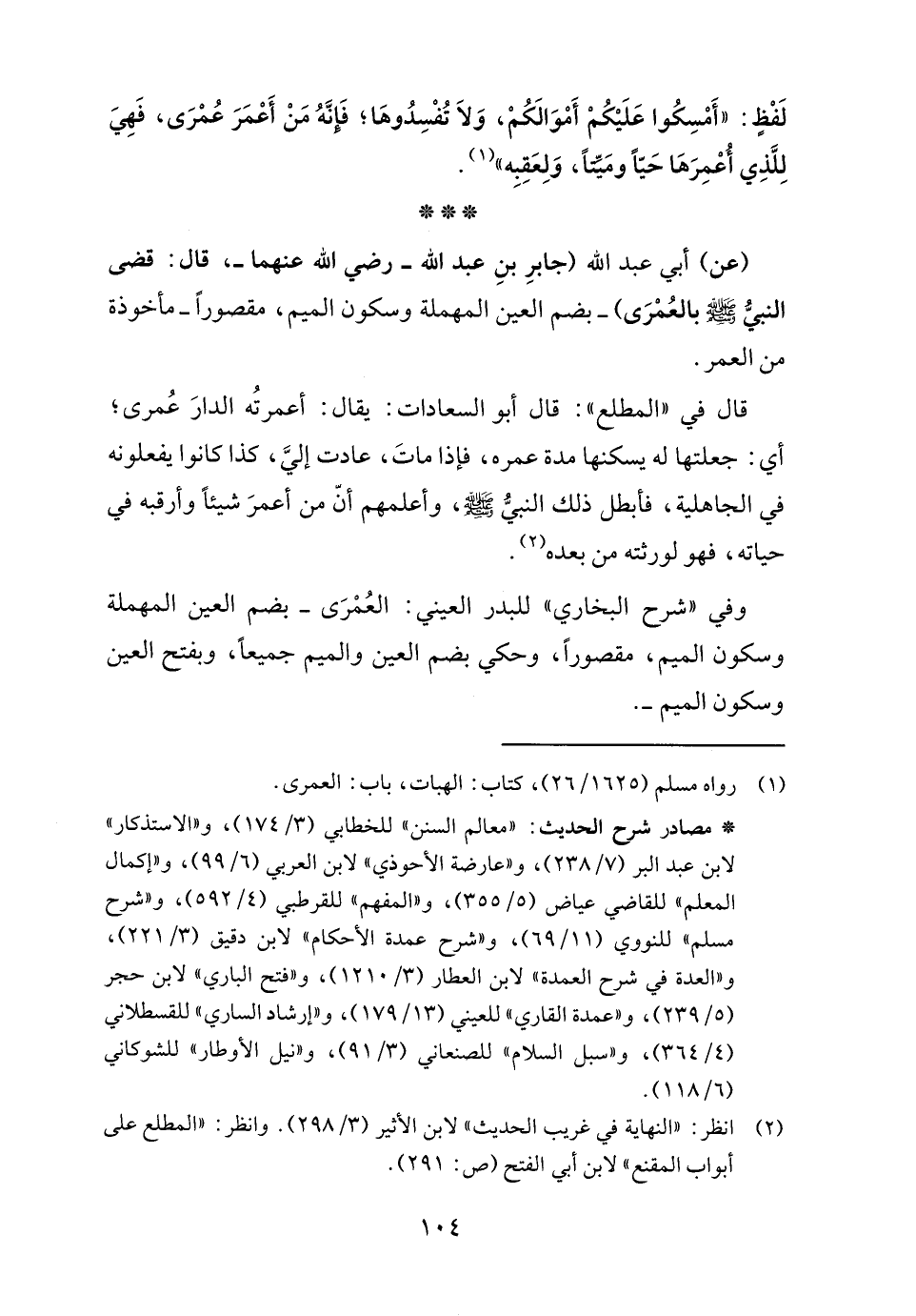 وفي "شرح البخاري" للبدر العيني: العُمْرَى -بضم العين المهملة وسكون الميم، مقصورًا، وحكي بضم العين والميم جميعًا، وبفتح العين وسكون الميم-.