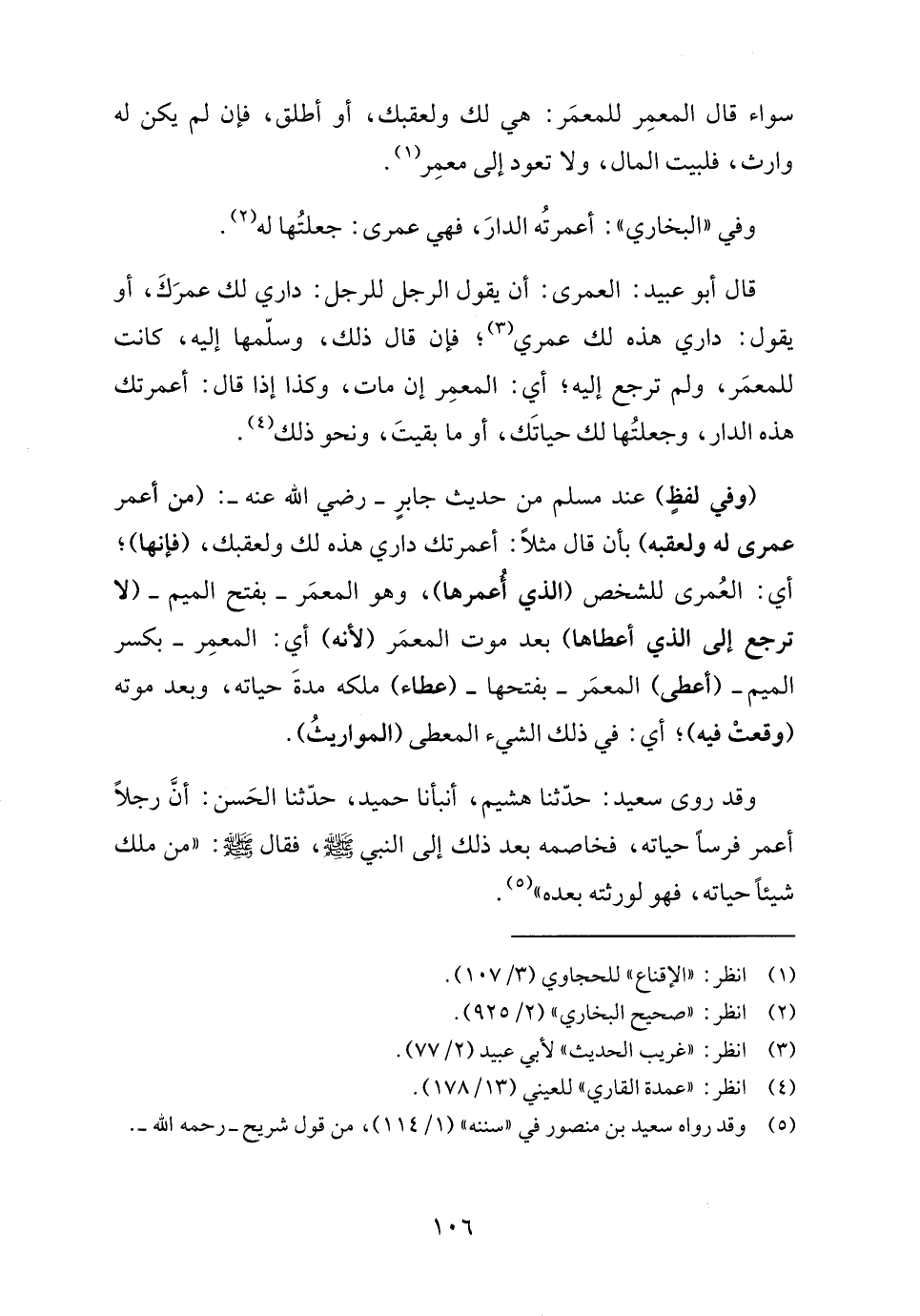 قال أبو عبيد: العمرى: أن يقول الرجل للرجل: داري لك عمرَكَ، أو يقول: داري هذه لك عمري (٣)، فإن قال ذلك، وسلّمها إليه، كانت للمعمَر، ولم ترجع إليه؛ أي: المعمِر إن مات، وكذا إذا قال: أعمرتك هذه الدار، وجعلتُها لك حياتَك، أو ما بقيتَ، ونحو ذلك (٤).